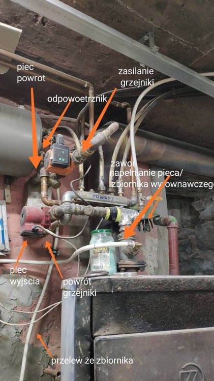 Mam pytania jeszcze. Czy jest sens używać ocynkowanych lub żeliwnych kolanek i trójników 1 cal do podłączenia instalacji pieca, czy robić to już na mosiądzu wszystko. Przypominam że pięć będzie okazyjnie uruchamiany. Mały przekrój poniżej 1 cała tylko mosiądz daje, natomiast cal i wyzej zastanawiam się czy wykorzystać ze starej instalacji te żeliwne kolano calowe czy kupić mosiądz. Druga sprawa dotyczy się podpięcia wymiennika ciepła. Zauważyłem że na zasilaniu jest zawór kulowy potem pompa (chodzi podczas palenia w piecu nie gazem) i zawór zwrotny (zdjecie1), natomiast na powrocie nie ma żadnego zawory (zdjecie2). Uważam że powinien być chodzby zawór kulowy, bo gdybym chciał wypiąć wymiennik to musiałbym spuścić cała wodę z instalacji. Kupiłem kolektor i w zestawie dostałem dwa odpowietrznik. W moim przypadku jest w ogóle sens na kolektorze montować te odpowietrznik skoro rury idą mi nad sufitem i jak już dostanie się powietrze to i tak będzie ono pod sufitem i odpowietrznik na kolektorze nic nie da. Ktoś mi też mówił, że pompa nie powinna być zawsze montowana na powrocie nie na zasilaniu. Prawda to? Wysłane z mojego Mi MIX 2S przy użyciu Tapatalka -