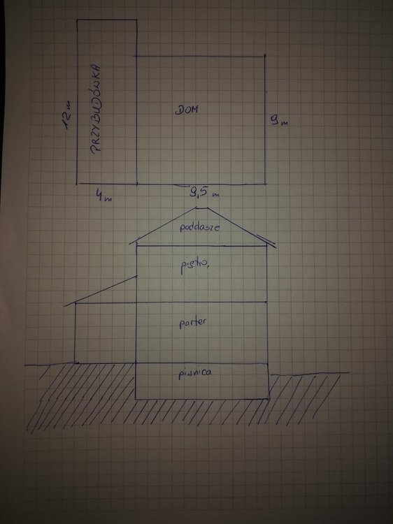 Jeśli chodzi o producenta pieca to zdecydowałem się na niego, ponieważ firma ta znajduje się w mojej okolicy, a poza tym większość kotłów na ekogroszek, które oglądałem są robione je jedno kopyto. Z kolei co do kalkulatora na stronie www.cieplowlasciwe.pl, to nie bardzo wiem jaką powierzchnię zabudowy wpisać, ponieważ mój dom ma nieregularny kształt tzn. chodzi o przybudówkę, która jest dostawiona do budynku i ma tylko jedną kondygnację (bez piwnicy). W załączeniu poglądowy rysunek przedstawiający rzut z góry i przekrój.