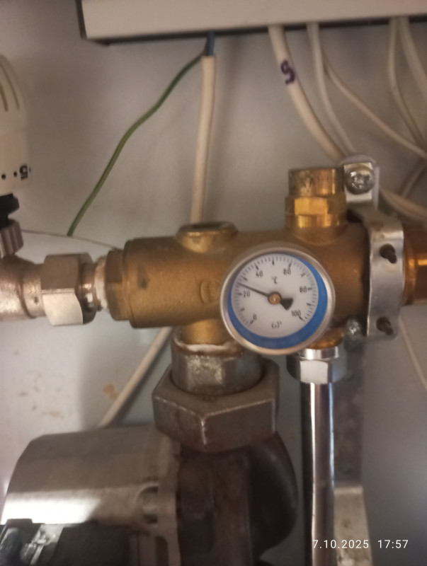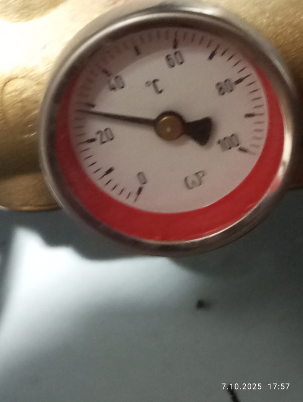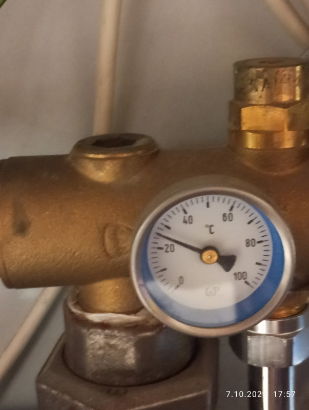 Tam juz jest otwarte na maksa nie da rady wiecej. Jedyny sposob po ktorym podskakuje temperatura na tych termometrach to gdy dość mocno przykręca ten niebieski zawór u gory ale nie wiem czy to sie przelozy na temperature pompowanej wody w podłogę. -