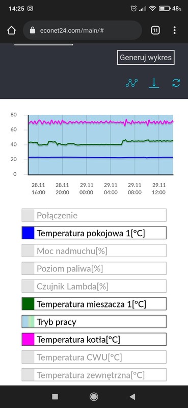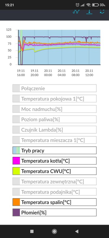 Tak ma chodzić kocioł. Kocioł utrzymuje temp zadaną. Moduluje mocą. Temp będzie spadać, on będzie szedł na wyższą moc do 100 procent następnie znowu moduluje mocą w dół. Po to masz modulacje żeby kocioł mniej palil. Dostosowuje moc do odbioru ciepła. Praca kotła w priorytecie na bojler gdy grzeje tylko bojler kocioł ma idealne warunki pracy. Robi sie wyzszy powrót niz na pracy na podłodze. Wyłacz prace w priorytecie na bojler. Włacz prace równoczesną pomp. Nie wskazane jest zatrzymywać pompe na podłogę. -