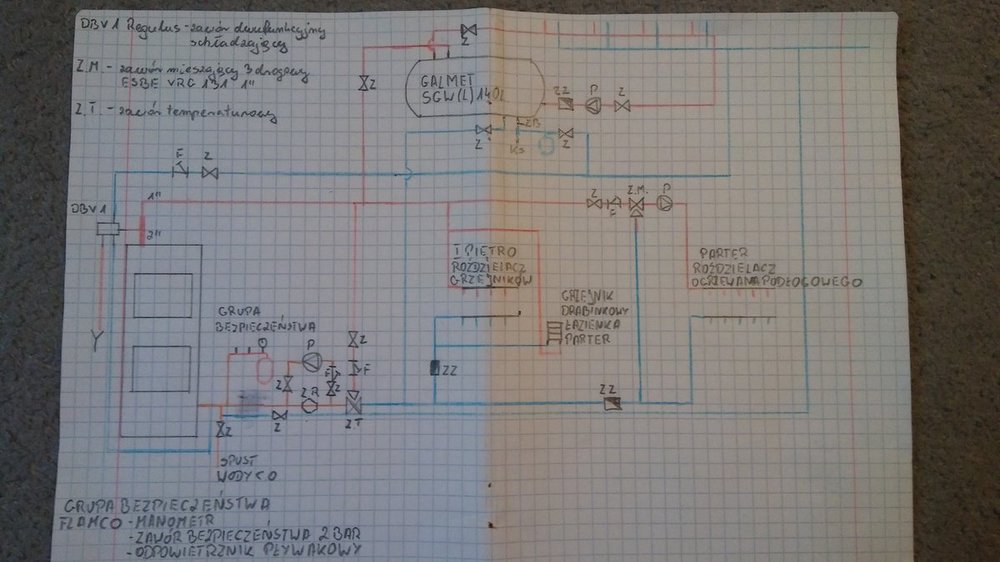 Stoję przed wykonaniem swojej pierwszej instalacji CO/CWU i chciałbym zwrócić się do Was o pomoc. Możecie spojrzeć na projekt celem sprawdzenia czy jest OK? Prosiłbym o wszelkie rady/komentarze/sugestie czy coś poprawić/zmienić, dodać bądź wywalić. Mam nadzieję że zdjęcie jej wystarczająco wyraźne. Dwie informacje których nie ma na zdjęciu - instalacja będzie zasilana kotłem zasypowym KIELAR - ECO 2, zawór różnicowy marki Tech-Pol ZR25 ( możliwość montażu w poziomie ).