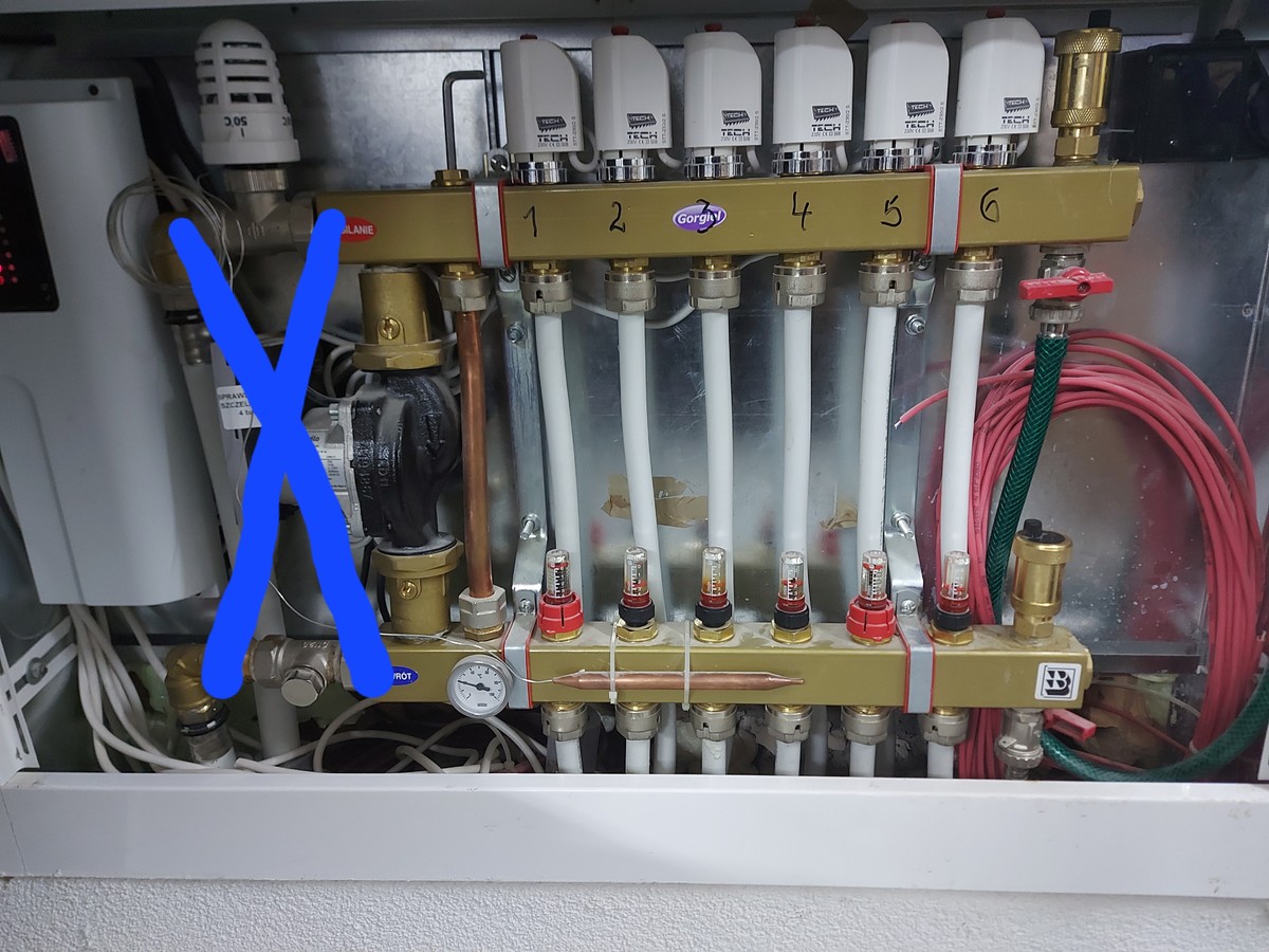 Mój bład panowie. Zapomniałem dodac zdjęcie Chce na krzyż wstawic rurki z zaworami kulowymi i bede zakrecał istniejacy juz mieszacz i powrót,pobpe obiegową wyłacze i zakrece zawory W ten sposób zawsze bede miał mozliwośc powrotu do starego systemu na mieszaczu aby podniesc temp na grzejniki. Normalnie to powinien tu byc zawor termostatyczny trójdrożny? Własnie tak to chciałem przerobic. Dzieki za wyjasnienie ale wiem ze belki w ukladzie bez mieszacza musza byc odwrotnie. A moze masz jeszcze lepszy pomysł jak to przerobic? Bo zamierzam jeszcze założyć termostaty z czujnikiem podłogi aby sie podłoga niewychładzała. -