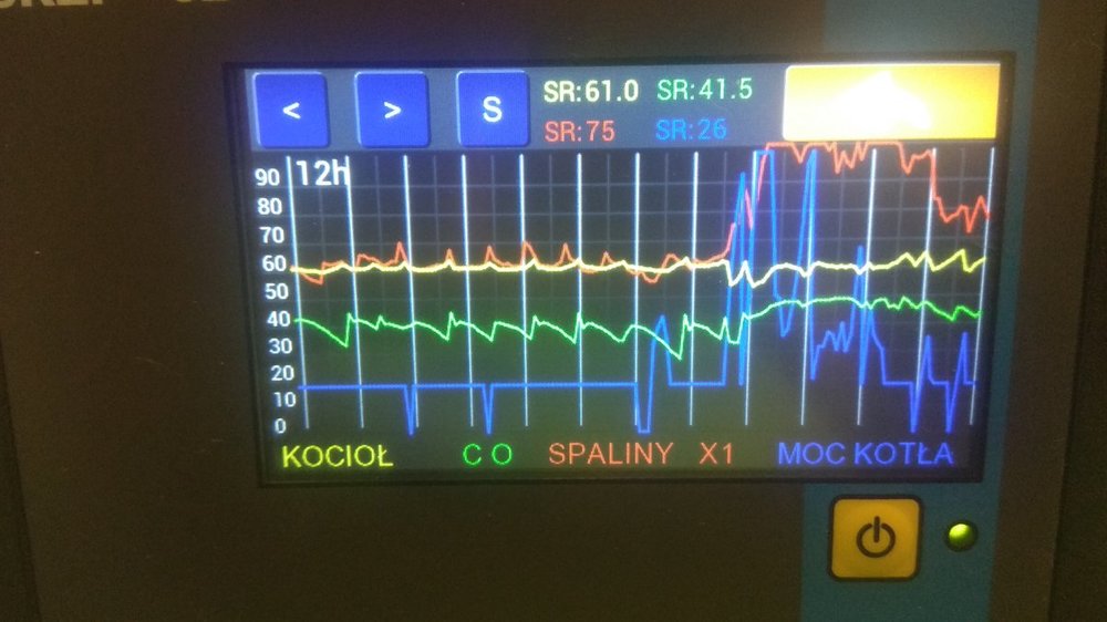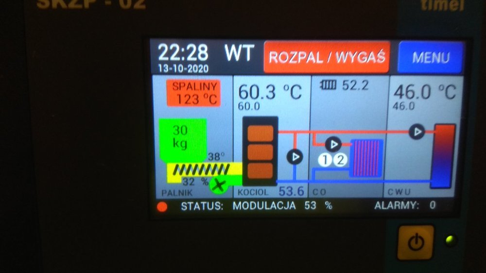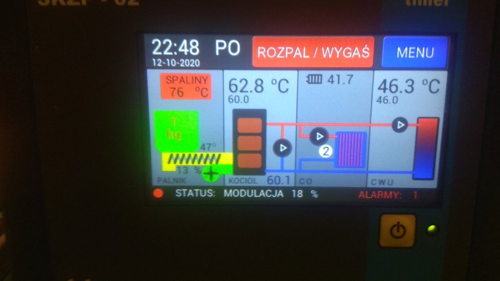 Mlo byc 15 procent min dmuchawa zmienilem na 8pr min tak dmuchawa 80w. Chodzi o to ze jak pracowaly wszystkie pompy cwu co i kotlowa to czeste byly podawania wegla i przez to duzo wegla spadlo nie spalonego. Tutaj koncowka fotki jak cwu wylaczone a co ustawilem by pompa zalaczala sie przy 63st.zdjecia Palnika zrobione o 22;44 a wykres o 22;48. Pompa co od 21.30 nie chodzila