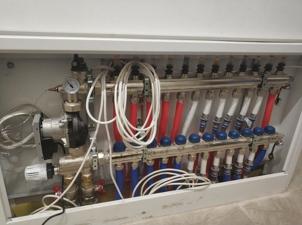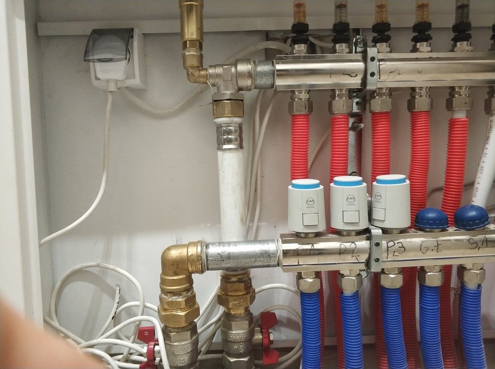 Dzień Dobry. Na wstępie chciałbym się przywitać. To jest mój pierwszy post na forum. Mój instalator jest w trakcie wykańczania instalacji C.O i C.W.U. Kocioł zamontowany Buderus GB072 14kw jednofunkcyjny z wolnostojącym zasobnikiem ciepłej wody 150 litrów. Dom to 140m2 plus garaż 35m2 razem około 175m2 budowany jako energooszczędny. Po całym domu z garażem rozprowadzona podłogówka. Nie mam nigdzie grzejnika podłączonego do C.O. Miało to na celu możliwie niskotemperaturową pracę kotła kondensacyjnego. Do tego dochodzi czujnik pogodówki, regulator Buderus RC310 i w trzech sypialniach osobne regulatory Saulusa podpięte po kablu. Rozdzielacz ma 12 pętli grzewczych z czego 1 na garaż pewnie będzie na stałe zamknięty. W międzyczasie zacząłem przeglądać Wasze forum jak i oglądać filmy na youtubie przez co naszły mnie wątpliwości czy wszystko jest robione zgodnie ze sztuką i czy faktycznie będzie to grzane w sposób ekonomiczny. Niestety instalator twierdzi, że jest wszystko ok a mi brakuje wiedzy i argumentów żeby wytłumaczyć jak to chcę mieć zrobione. Dołączam zdjęcie gdzie jest rozdzielacz z osprzętem. Pompa to prawdopodobnie WILO YONOS PARA RS 25/6 RKA M. To co mnie martwi to pompa z układem mieszającym oraz termostat kapilarny. Ja to rozumiem tak, że woda na powrocie nie potrzebnie miesza się z zasileniem przez co obniża całą temperaturę. W dodatku na rotametrach mogę regulować tylko w zakresie od 0 do 2 litrów pomimo podziałki do 4 litrów przez co mam chłodne dwie sypialnie i nie mogę nic podnieść. Sterowanie regulatorem i pogodówką na tym etapie nie działa bo instalacja jest w trakcie kończenia więc palnik pracuje 24h. Pomiędzy rozdzielaczem a kotłem mam zamontowane tylko jedno poziome urządzenie ( zdjęcie poniżej ) nie wiem czy to jest sprzęgło czy coś innego. Proszę o pomoc przy decyzji co trzeba zmienić ( wyrzucić lub dodać ) aby to wszystko pracowało wydajnie. Na jednym z filmów na youtubie widziałem, że powinienem wywalić z rodzielacza pompę z mieszaczem oraz termostatem kapilarnym i oddzielić zasilenie od powrotu a przez to, że instalacja jest średnioduża to na filmie zalecano dodać pompę obiegową na zasilenie i sprzęgło z czujnikiem. Czy ja dobrze to rozumuje? Jeżeli faktycznie trzeba dodać pompę obiegową i sprzęgło to proszę o informację jaką pompę i sprzęgło powinienem kupić. Niestety instalator poinformował mnie, że jak będę chciał inny sprzęt to mam mu podać konkretnie jaki bo on nic mi innego nie doradzi niż to co mi zainstalował. Czy pompa obiegowa może być ta która jest przy rozdzielaczu czy ma być jakaś inna? No i czy jak wywalę te rzeczy z rodzielacza to czy nie powinienem tam zamontować jakiś odpowietrzników i bypassów. Jeżeli potrzebne są ode mnie jakieś dodatkowe dane to proszę pytać. Na pomoc od instalatora nie liczę więc szukam rady w internecie. Pozdrawiam Wszystkich