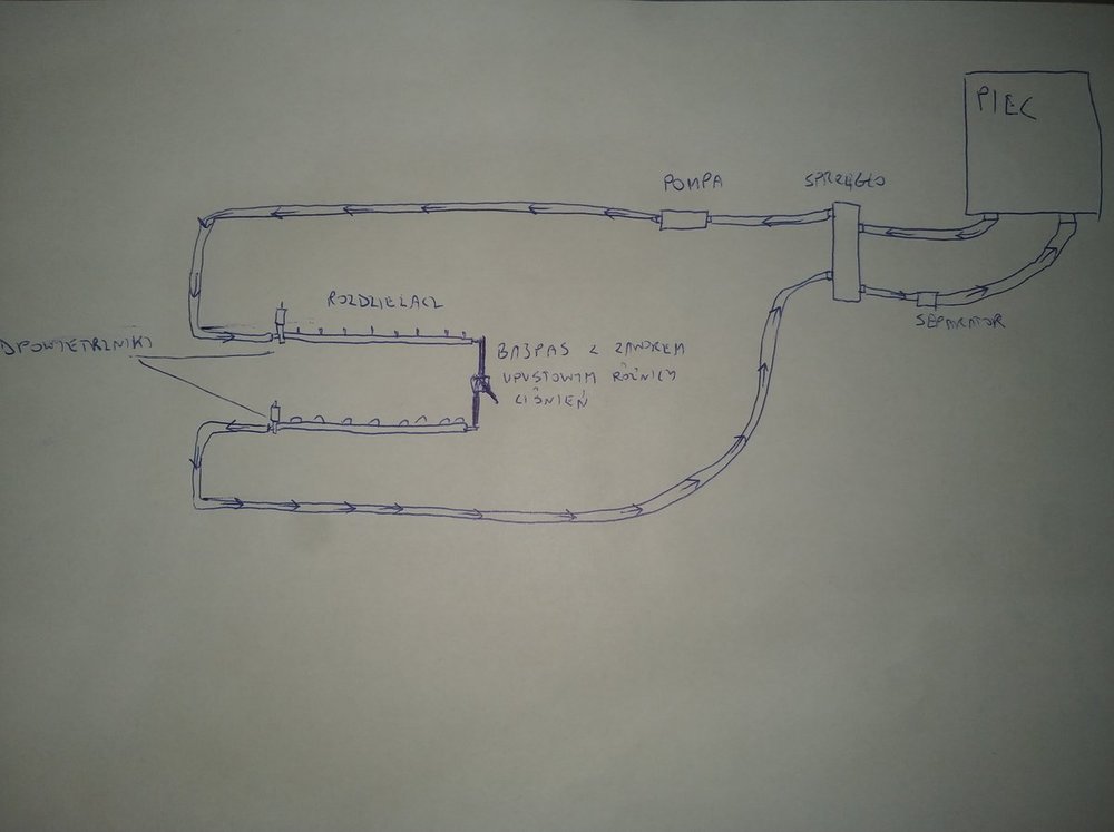 WojtuNie Ten odpowietrznik to jest razem z tą rurą łączącą się z pompą. Teraz nie ma wszędzie przepływu 2litry/h. Właśnie nie mogę więcej niż 2 litry ustawić pomimo że podziałka jest do 4. Większość jest na 1 lub 1,5. A ten pex to już chyba jest nie do zmiany jak idzie w podłodze? Chyba, że chodziło tylko o tą widoczną część do sprzęgła. Już zgłupiałem jak to ma wyglądać a jutro instalator zapowiedział, że kończy wszystko. Przesyłam odręczny schemat jak ja to widzę. Proszę o uwagi ponieważ takim schematem będę tłumaczył instalatorowi co chcę. -