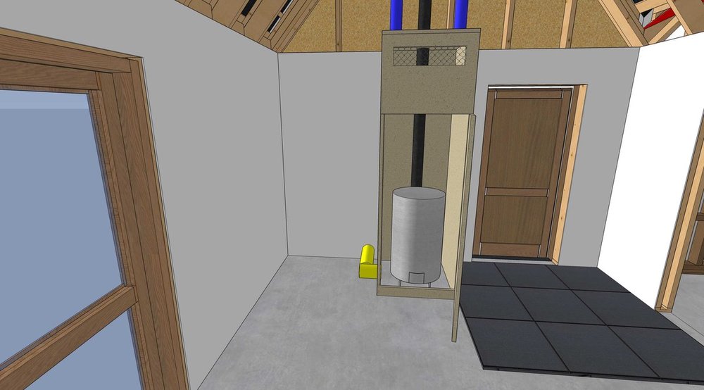 3. Hej. Jestem na etapie wykańczania pomieszczenia pod nieduży warsztacik stolarski. Z racji tego, że produkuję trochę trocin w sezonie, to chcę wstawić do pomieszczenia piec na trociny ("trociniak") i tym ogrzewać (dogrzewać) pomieszczenie.Problem w tym że pomieszczenie jest dość długie i wąskie (ok. 12m x 3,8m), a miejsce na trociniak mam praktycznie na jednym z końców, więc szukam sposobu na skuteczne rozprowadzenie ciepłego powietrza.Zastanawiam się nad wykonaniem jakiejś obudowy na trociniak (np. z płyt Varmsel) z której "łapałbym" gorące powietrze u góry i rurami rozprowadzał do dalszej części pomieszczenia.Popełniłem w sketchupie poglądowy rysunek. Żółta rura to doprowadzenie powietrza z zewnątrz przez ścianę. Niebieskie rury to miałoby być rozprowadzenie powietrza. Czarna to oczywiście komin. Co sądzicie o takim pomyśle?