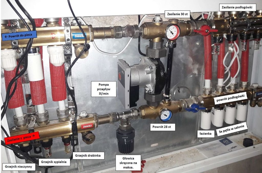 mój błąd że nie wspomniałem iż mój rozdzielacz jest umieszczony w piwnicy...zasilanie grzejników jest na dolnej listwie, zasilanie podłogówki za mieszaczem na górnej listwie, na powrotach założone siłowniki. -