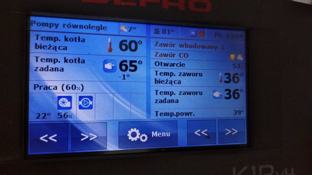 @gersikustawiłem około 11 ustawienia na 15kw. Ustawiłem tylko na zaworze minimalne 30% bo z tego co zauważyłem to pracuję ciągle na 36-42%. Skok na 5%, kontrola na 60s. Teraz wyłączyłem ochronę powrotu. Pompa kotłowa ciągle pracuję. Korekta na 0 Wrzucę wieczorem zdjęcia jak to wygląda. Jedynie to zauważyłem że jak zmieniłem na ustawienia fabryczne okolo 11 To temp spalin podniosła się do 150stopni. Teraz wszedł w nadzór. Zmieniłem moc na 90 i poczekam do wieczora bądź jutra rana. Ps. Temp spalin miałem na poziomie 70 stopni. Wyczyściłem go wczoraj i pokazywał około 120, teraz po fabrycznych na 15 kw już 150 -