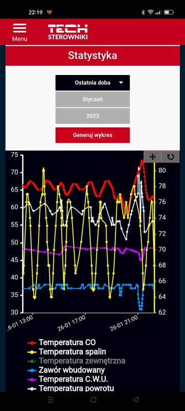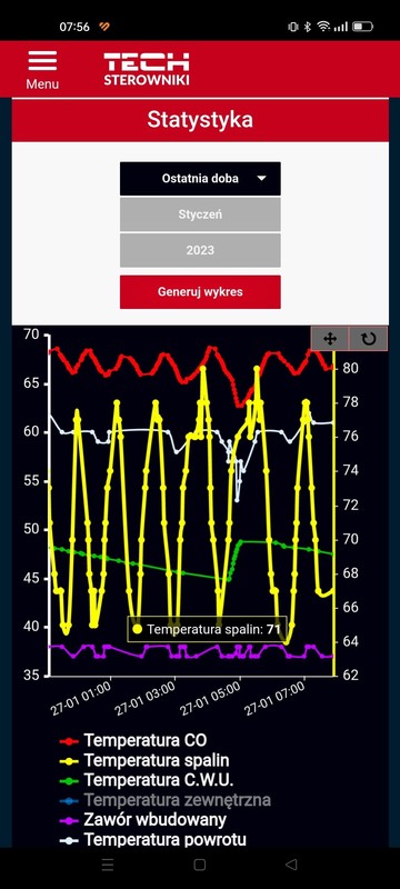 Temperature zadana z 65 zmieniłem na 68 żeby podnieść trochę powrót. Korektę powietrza w nocy miałem na 0. Taki kopczyk jest jak na zdjęciu po około 12 godzinach. Temperature zadana przebija o około 2 stopnie w każdą stronę. Czasem coś się dzieje na zaworze - albo włącza się pompa cwu i spada nizej albo i przebija więcej. Co do zaworu to zmieniłem z powrotem ten skok na 5% i minimalne otwarcie na 10% -