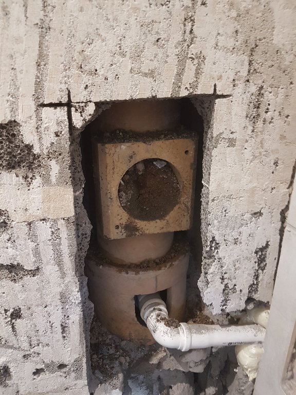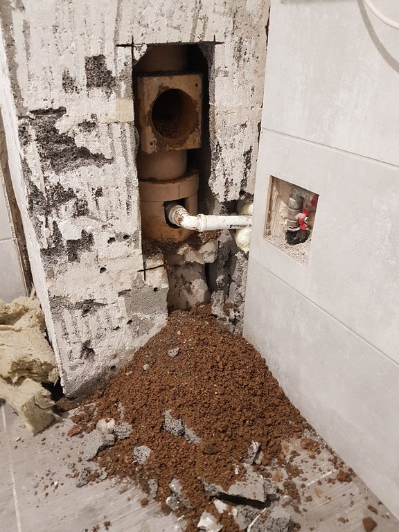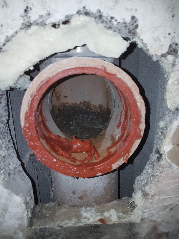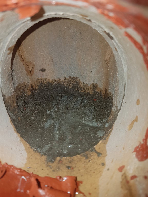 Na zdjęciu (zdjęcie 1) widać jak sciana nasiąka skroplinami... Co ciekawe... Wczoraj odkryłem, że komin spalinowy poniżej wpięcia rury z pieca jest... zasypany piachem i zalany cementem.... przez to kondensat nie mógł dojść do odpływu (zdjęcie 2,3,4,5). Masakra...