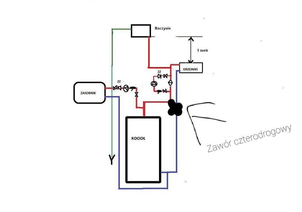 Odpowietrzniki za pompami, zawór 4d bez siłownika. Naczynie myślę że jednak jest wyżej od bojlera o jakieś 2 metry.
