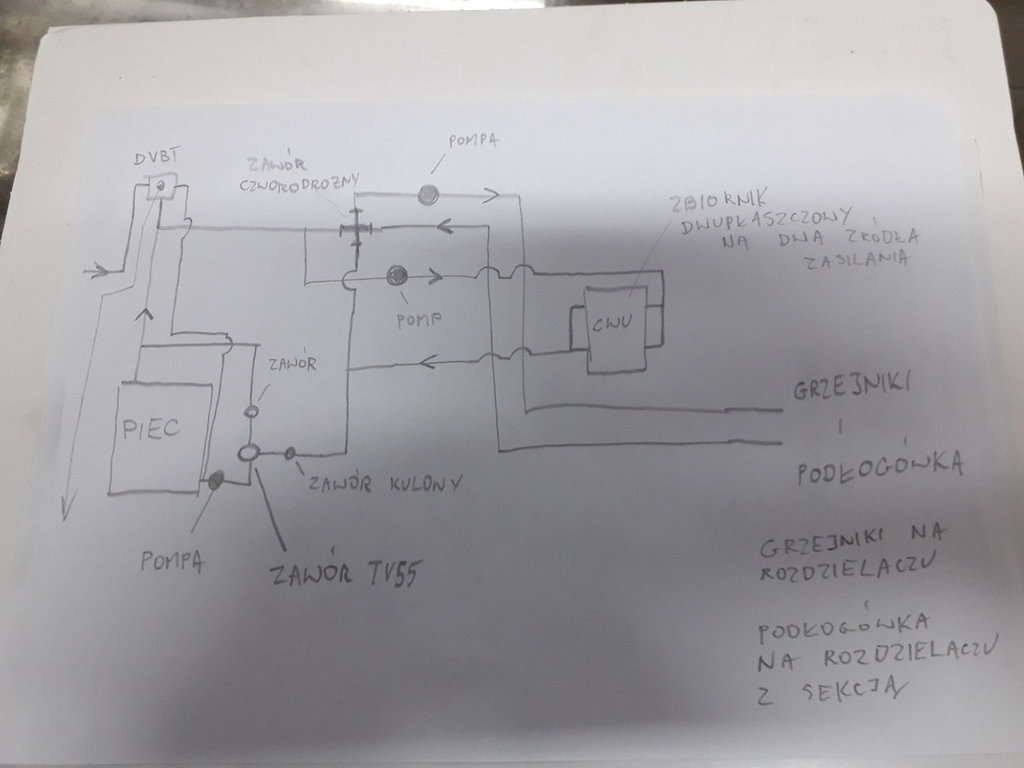 Problem jest następujący. Nastawienia na picu fabryczne poza mieszaczem1 50 stopni i mieszaczem2 35stopni. Piec tem.75 i dobija do 55 i uruchamia pompy co i powrotu. Po kilku minutach temperatura na mieszaczu1 spada i wyłącza pompy. Tak przez 3 godziny i powrót instalacji zimny. Instalacja na zaworze czworodrożnym. Pozycja zaworu czterodrożnego cały czas na maksa na zasilanie instalacji i mam wrażenie że ani troszke nie puszcza na powrót(na zawór tv 55) ciepłej wody a piec dostaje na maksa zimą z powrotu i sie wychładza.