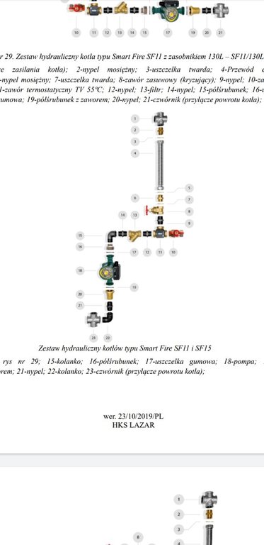 Piec Lazar Smartfire 15 + sonda.Panel pokojowy z termostatem. Na piętrze 8 grzejników. Na parterze około 60m2 podłogówki. Instalacja na zaworze czterodrożnym z siłownikiem. Wszystko podłączone zgodnie ze schematem. Odebrane i odpalone na pierwszyn rozruchu przez serwisanta.