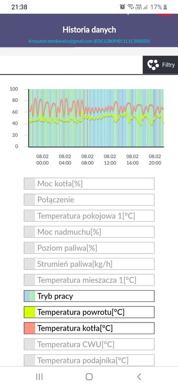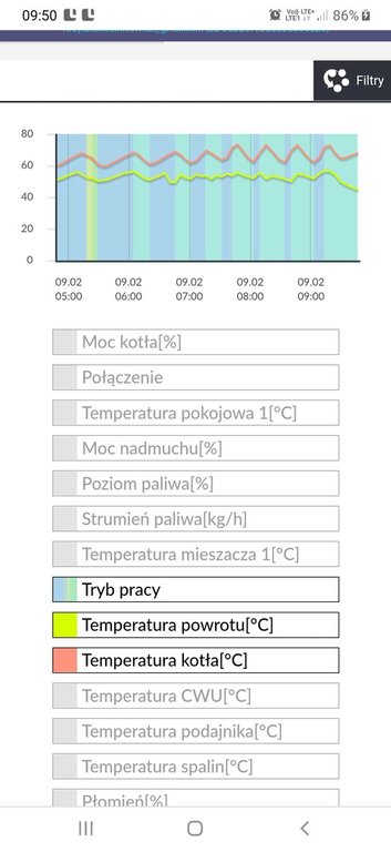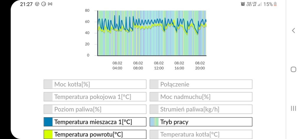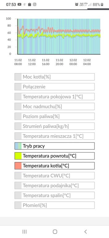 Tak bo zanim ruszy pompa to kocioł dojdzie do temp 55°C i wtedy zacznie się podnosić temp mieszacza oraz powrotu bo pompa przy tym układzie przed zaworem podaje jednocześnie ciepłą wodę na mieszacz i ba powrót. Rozdziela strumień dzięki czemu nie schodzi na raz tak duża ilość wody chłodnej. Wcześniej schodziĺa duża ilość i na powrót nie szła wystarczająca ilość ciepłej żeby to zrównoważyć. Grunt że nie zalewa kotła zimna woda. @papen76 dziś w dzień paliłem z nadzorem co widać na wykresie. I też się zastanawiam czy na te temperatury na dworze nie wyjdzie to lepiej niż wygaszać kocioł Teraz kocioł się rozpala właśnie. -
