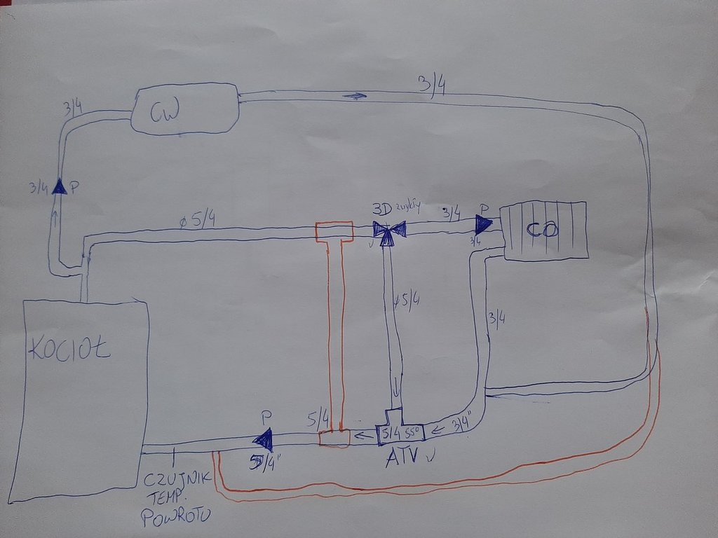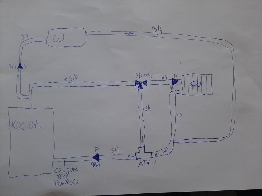 10. No właśnie jak by pompa.btła na powrocie a przed nią zawór 3D to wtedy proporcje regulacji zmieniły by się i obieg CO został by dobrzany wtedy nie musiał bym kupować zaworu ATV tylko ten 3D po ustawieniu zrobił by tę samą robotę? Czyli taki schemat będzie poprawniejszy?