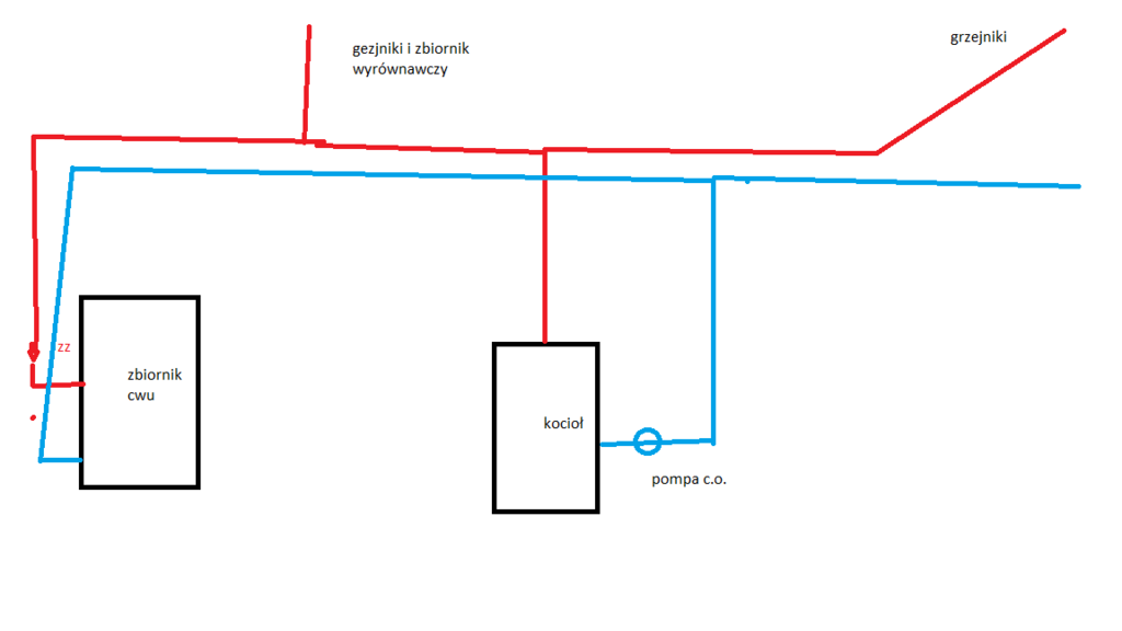 3. Witam. Jestem u Was nowy. Mam problem z geawitacyjnym rozbiorem ciepla z cwu, wiem że temat był wałkowany, ale zgodnie z radami wyczytanymi na tym i innych forach zamontowałem zawór zwrotny sprężynowy na zasilaniu zbiornika, lecz pomimo tego, że nie pali się w kotle mam ciepe rury zasilania zbiornika i grzejnik na górze.Pomocy bo mma dość pseudohydraulików. Poniżej schemat instalacji.