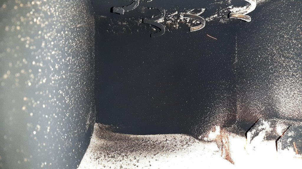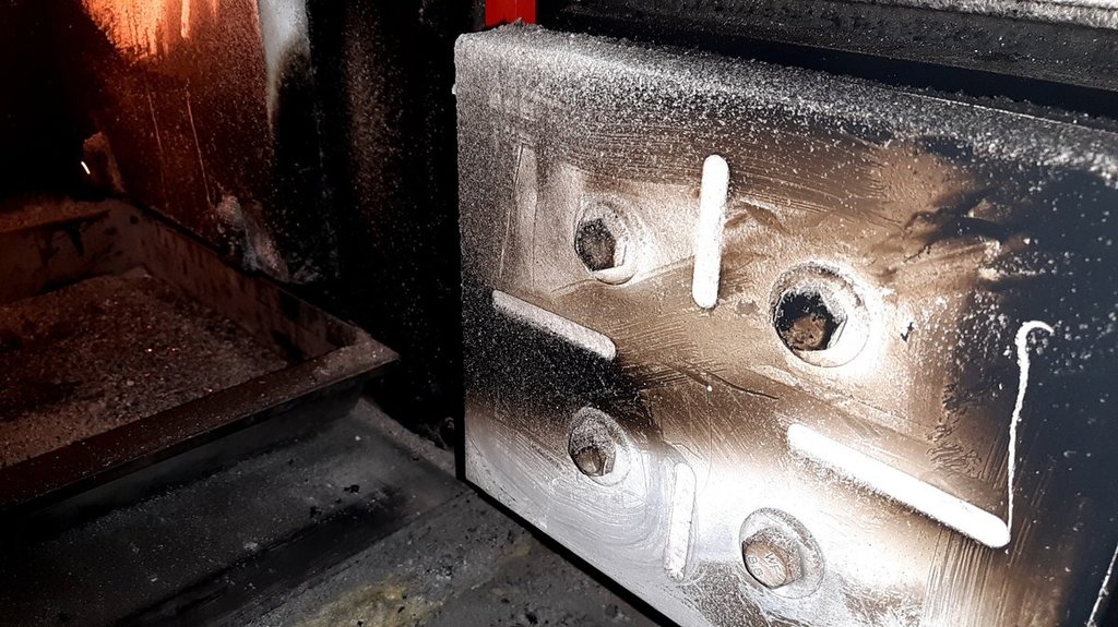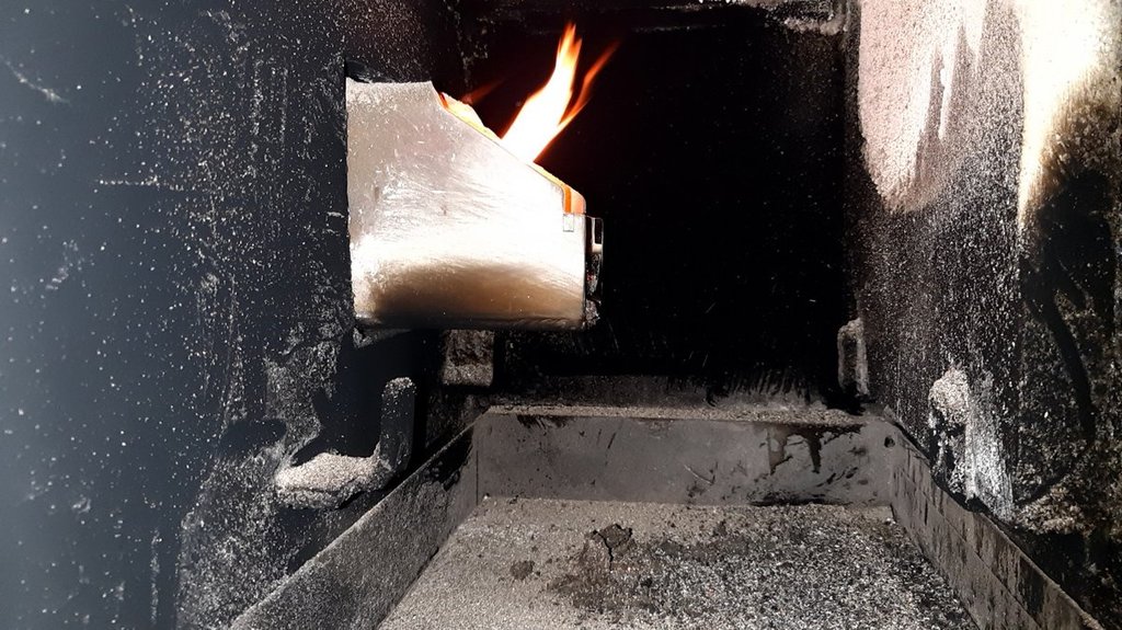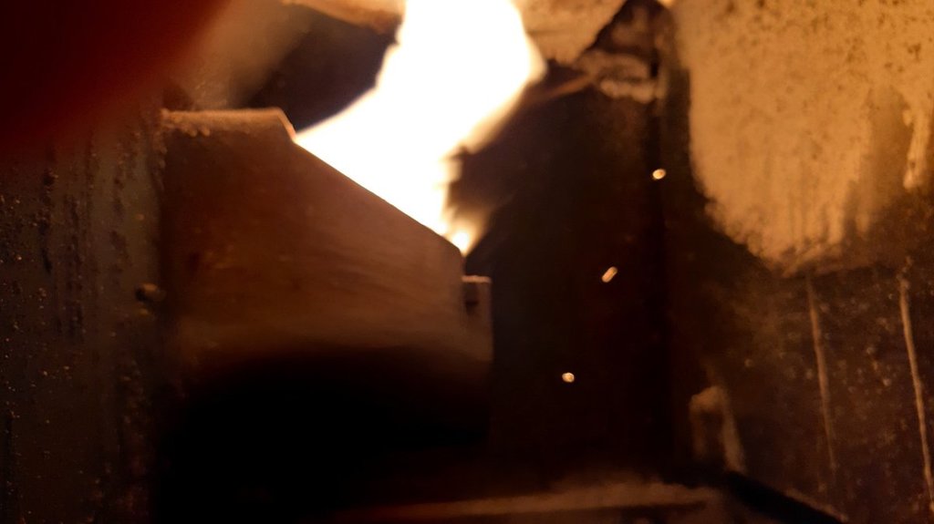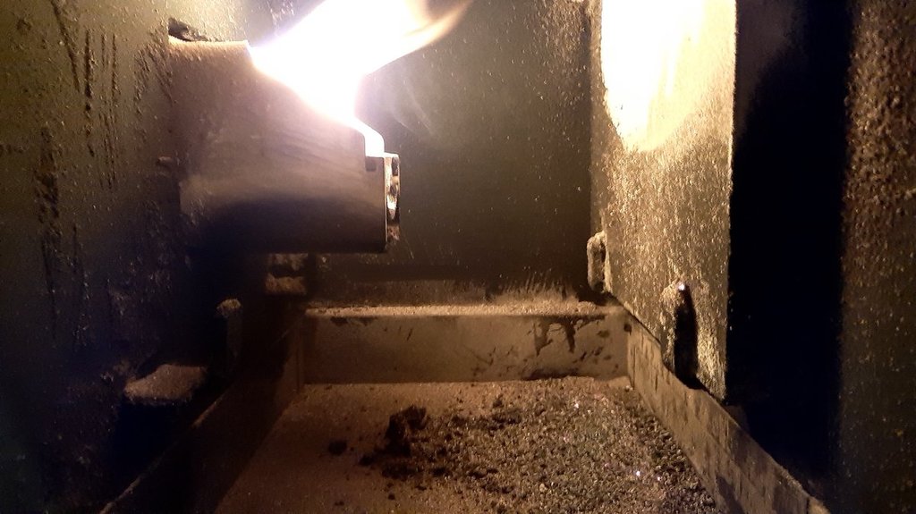 Z kotłem ok., dom ogrzany, kocioł chodzi w trybie pracy ciągłej, więc większość czasu na dość niskiej mocy. Automatyczne wygaszanie i czyszczenie co 6 godzin. Zastanawiam się tylko czy pellet spala się właściwie. Latem kiedy dogrzewam CWU kocioł pracuje na 100% to popiół jest ładny, od jesieni pojawiają się spieki. Nie wiem czy dolny wentylator nie powinien być jeszcze niżej ustawiony, teraz mam 330 obrotów. Płomień przy tych obrotach wygląda tak jak na zdjęciu poniżej, przy okazji zdjęcie komory spalania i popielnika. Temperatura spalin przy tym płomieniu ok. 100 st.C. Popielnik po jednym dniu pracy.