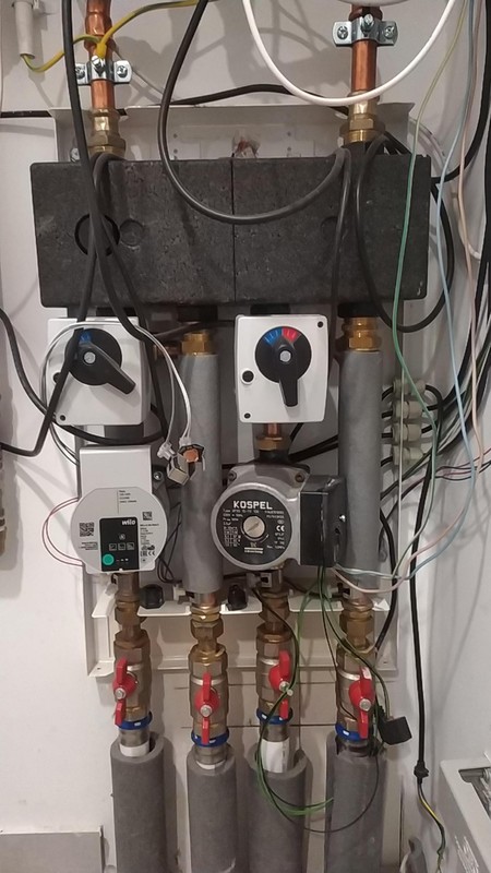 Witam serdecznie. Problem dość powszechny ale dwóch hydraulików nie potrafiło sobie poradzić z problem* w tym jeden wykonawca. Ogrzewanie w pełni podłogowe. 100%. Dom piętrowy: 1. Na parterze dwa rozdzielacze A) Jeden z 5 sekcjami B) Drugi z 10 sekcjami - jak na zdjęciu nr. 1 2. Na piętrze dwa rozdzielacze A) Jeden 5 sekcji B) Drugi 5 sekcji * Z górą nie ma problemu rotametry przepływ w okolicy 1,5-2l i jest fajnie. * Problem jest na dole. Włączając ogrzewanie na dole jeśli wszystkie sekcje są włączone to przepływ maksymalny wynosi 0,5 i to w porywach. Jeśli zamknę rozdzielacz z 5 sekcjami na dole to na tym z 10 sekcjami wzrost będzie rzędu 0,1 czyli w teori i praktyce nic :(. Na zdjęciu 5 widać pompkę z obiegu na górze, taka sama była na dole. Jeden z hydraulikó wymienił to wilo i wstawił KOSPEL jak na zdjęciu nr. 6. Niestety wymiana pompki na mocniejszą nie pomogła. Dalej przepływ, praca jest fatalna (przepływ w okolicy 0.5 i mniej). Czy problem nie będzie z wąskim gardle, które zauważyłem ( zaznaczyłem na zdjęciu nr. 3 )? Czy więcej zdjęć potrzeba? Jakieś sugestie? Propozycje? Może zapowietrzona jest instalacja? Dla mnie instalacja chodzi, pracuje głośno, druga sprawa jak podejdzie się do rozdzielacza to słychac bulgotanie, takie syczenie z rotametrów.