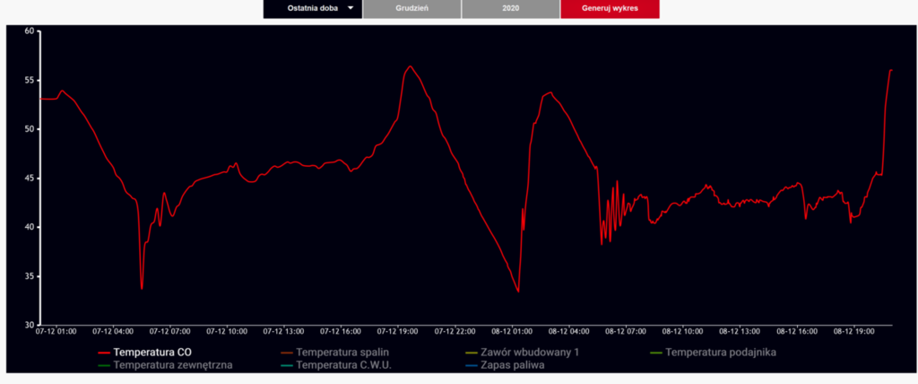 Posiadam moduł internetowy i zobaczyłem wykres temperatury CO z ostatniej doby i oto co zastałem. ciekawe jest to co było przed chwilą bo w ciągu 30 minut temperatura podskoczyła o 10 stopni. Na regulatorze pokojowym ma ustawione dzień(23stopnie)/noc(21stopni).