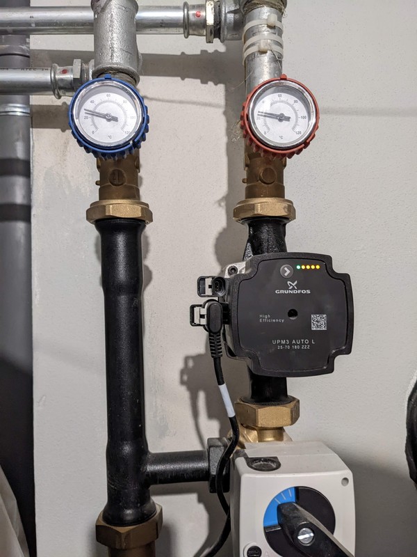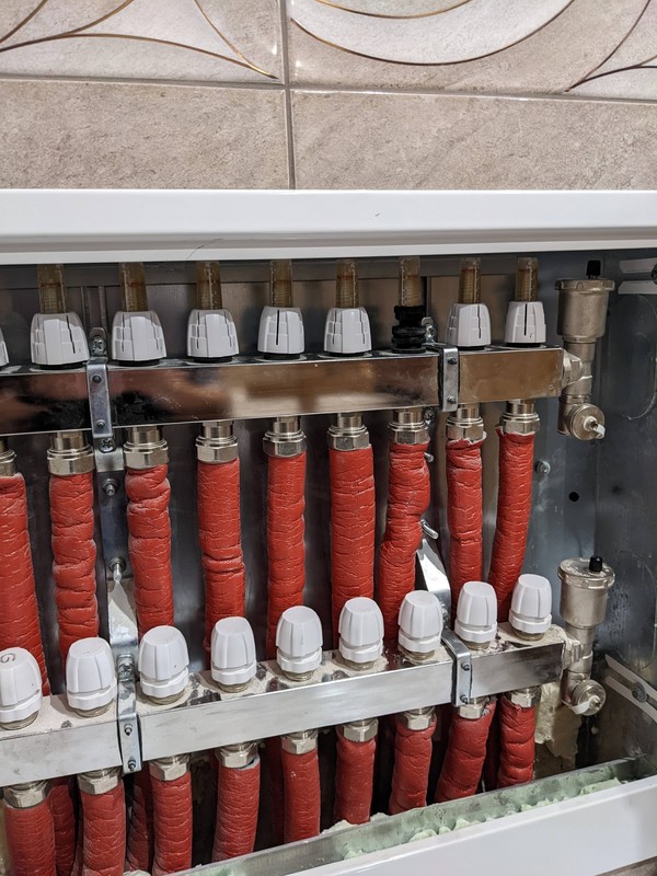 Siemka! Od jakiegoś czasu walczę z ustawieniem temperatur dla poszczególnych obiegów podłogówki na piętrze, jako że wszystko mam obsługiwane z jednej grupy pompowej (parter oraz piętro - na dole 7 pętli + grzejnik drabinkowy podłączony pod rozdzielacz, na górze 8 pętli + grzejnik drabinkowy podłączony pod rodzielacz). Jedno z pomieszczeń notorycznie jest niedogrzane, inne przegrzane itd. Instalację zrobili mi tak beznadziejnie że nawet nie oznaczyli gdzie która pętla dokładnie biegnie itd, ogólnie straszny dramat. Doszło do tego że ogarnąłem sobie kamerę termowizyjną i sam ustaliłem gdzie jest co i jak. Jednakże ciągle mam problem z jednym niedogrzanym pomieszczeniem. Jak już ustaliłem które pętle gdzie są to zacząłem regulować to rotametrami, jednak jedna pętla z niedogrzanego pomieszczenia zachowuje się bardzo dziwnie, a raczej rotametr od niej. Rotametr tej pętli praktycznie nie reaguje na regulacje, jednak jak zamykałem i otwierałem całkiem obieg na danej pętli to widać jakby się zamykał (podskakuje, ale nie idzie do samej góry). Stwierdziłem że obieg jest zapowietrzony chyba, więc zamknąłem wszystko, dałem pompkę na maxa i wszystko na tę pętlę, rotametr praktycznie nie reagował, ale słychać był szum przepływającej wody, gdy zamykałem powrót, szum ustawał. Sama pętla generalnie coś tam grzeje, bo widać to na termowizji, ciężko stwierdzić jak dobrze bo mam panele i termowizję dość słabej klasy, aczkolwiek nagrzane rurki widać 🙂 Zgodnie ze zdjęciem, gdy pompki w ogóle nie pracują, rotametr leży na samym dole (tam gdzie strzałka), pomimo że jest pełen wody. I teraz, czy może to być uszkodzony rotametr, czy trzeba odpowietrzyć pętlę metodą "przelania wody"?