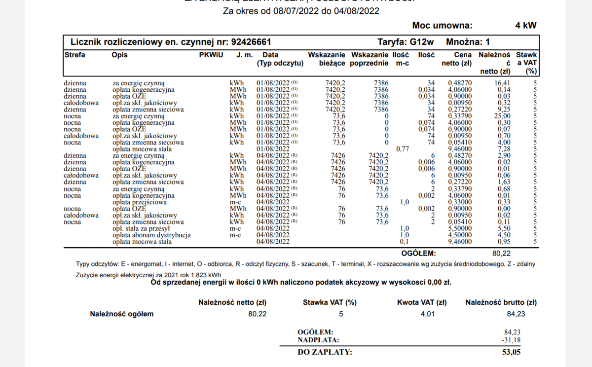 8-go lipca byla zmiana taryfy na G12w. Rozliczenie jest do 04.08. 40kwh (drozszych) 76 kwh(tanszych). Do zapłaty 84 zl. ( nadpłatę mi odliczyli) W taryfie G11 zapłaciłbym 90zl.