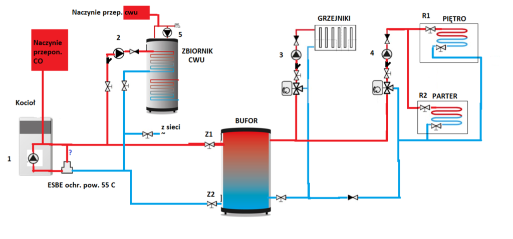 - ochrona powrotu kotła zawór termostatyczny ESBE 55 C, CWU ładowane osobną pompą (nr 2 na rysunku)