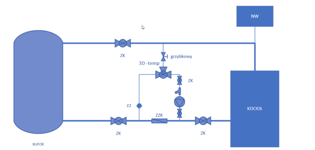 Dzień dobry. Lepiej późno niż wcale: Chciałem podzielić się wersją, którą ostatecznie zmontowałem. Może się komuś przyda taki egzotyk. Zadecydowały koszty i czas potrzebny do przeróbki tego, co już było i wysokość umieszczenia naczynia wzbiorczego (dlatego pompa nie na powrocie). Zielone koła to czujniki temperatury do sterowania 3D (właściwie to tylko dolna jest wymagana). Czerwone - to czujniki do sterowania pompą (uwzględniają temperaturę kotła i różnicę temperatur). ZZK - zawór zwrotny klapowy zawory odcinające pominąłem na rysunku Temperatura na powrocie trzyma się zadanej wartości, regulacja 3D z interwałem 30s (oczywiście jeśli jest potrzebna). Dzięki sterownikowi mogę ją sobie dowolnie zmieniać również podczas pracy. Co ciekawe - obieg grawitacyjny do bufora potrafi też ciągnąć wodę nawet jak pompa pracuje (nie zaglądałem czy zawór zwrotny nie złapał może jakiegoś paprocha). -