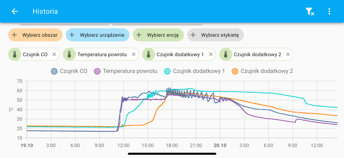 @Matejko1 ochrona powrotu działa świetnie. Mam jedynie problem z ucieczką ciepła z bufora. Myślę, że kiedy w dolnej części bufora jest gorąca woda a kocioł wygarnięty, to kocioł staje się odbiornikiem. Zamykam wtedy zawór na rurze powrotnej, ale termometr na kotle i tak pokazuje temperaturę powyżej tej w piwnicy. Na wykresie czujnik dodatkowy 1 to góra bufora, a czujnik dodatkowy 2 to dół bufora. Wahlowanie pod koniec palenia to pewnie włączająca się co chwilę pompka CO - jak kocioł nie daje więcej niż na dnie bufora, to pompka się wyłącza. Otwarcie zaworu powrotnego na 100% to czas, kiedy już nie ma skąd brać zimnej wody i powrót przekracza zadane 50 stopni. Może powinienem ustawić powrót 60-70 i z kotła puszczać od razu 80 do bufora… Już tego nie badam dokładnie - działa wystarczająco, a ja myślę o pompie ciepła. Chociaż się boję, to mój licznik ciepła pokazał 9MWh na sezon. Dziwne jak na stary dom. W razie potrzeb mam trochę tych wykresów z czujników i zaworów. Wrzuciłem świeże z wczoraj. -