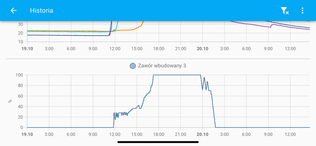 1. Hertz 3d chyba dn25 siłownik chyba też hertz. (Na podłogówkę mam Afriso, też spoko). Miałem przyszykowany dn20, ale reszta rurek bardziej pasowała pod dn25 . 2.W instalacji były i1-CWU, i1-m i st25cwu. Zamieniłem na i3-plus - wolałem jeden sterownik (a mam jeszcze bojler i dwa obwody podłogówki) i jest tam kilka bajerów, z których może kiedyś skorzystam. Te zdemontowane czekają, aż je wystawię na sprzedaż 😉 na jakimś olx. 3. Podobne wykresy są dostępne po dokupieniu modułu ethernet lub wi-fi od Techa. Dane idą do chmury techa i są dostępne w aplikacji e-modul lub przez www. Przez chmurę można też zmienić ustawienia. Ale największy bajer dla mnie to wykresy - pomagają w diagnostyce. Te, które prezentuję, to z HomeAssistant (serwer automatyki domowej open source) - przyjemniejsze w obsłudze i w HomeAssistant zrobiłem sobie jeszcze taki bajer, jak poniżej (bufor, bojler, pompa ciepła do CWU, podłogówki, termostaty… na jednym obrazku): HomeAssiatant ściąga dane z serwera techa, więc idzie to trochę w kółko, ale tak najłatwiej było zrobić. 4. Pompka to Grundfos UPS 25-40 - raczej za duża, ale taka była kupiona razem z domem. @Matejko1 zwróć proszę uwagę, że użyłem rozwiązania innego niż w pierwszym poście (patrz post #21). Zdecydował o tym przede wszystkim dosyć uciążliwy wymóg wysokości naczynia wzbiorczego w przypadku pompy na powrocie. Chociaż to była już spora ostrożność - nie chciałem ryzykować poprawki. -