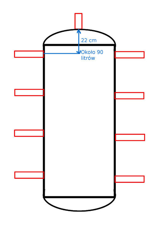 Kotłownia z buforem ciepła - opinie, uwagi, pytaniazielonykosmita odpowiedział(a) na MaaGdA temat w Instalacje CO i CWU Może uda mi się reaktywować temat Planuję w nowym domu ogrzewanie kotłem zasypowym Setlans multifuel wraz z buforem ciepła 1000 litrów. Kocioł i bufor już mam. Bufor kupiłem produkcji firmy Lemet. Niestety najwyższy króciec (zarówno wlotowy z kotła jak i wylotowy na instalację) jest około 22 cm poniżej najwyższego punktu. Obliczyłem że objętość bufora od tego króćca do szczytu dennicy to około 90 litrów. jeżeli dobrze myślę to przy rozpalaniu ciepła woda z kotła będzie się unosić do góry i wypełniać najpierw górną część bufora. Dopiero gdy nagrzeje się te 90 litrów, poziom ciepłej wody sięgnie krawędzi najwyższego króćca i woda będzie mogła zacząć ogrzewać dom. Natomiast gdy w kotle nie będzie się już paliło i dom będzie ogrzewany wodą z bufora nie będzie się dało odzyskać ciepła zgromadzonego w wodzie powyżej najwyższego króćca. Nie dość że według moich obliczeń bufor ma mniejszą o około 60 litrów pojemność od deklarowanej, to jeszcze te 90 litrów nie było by wykorzystane. Teraz pytanie: czy wyjście na instalację ogrzewania domu można podłączyć z króćca w szczycie dennicy który według producenta bufora ma służyć do wkręcenia odpowietrznika?