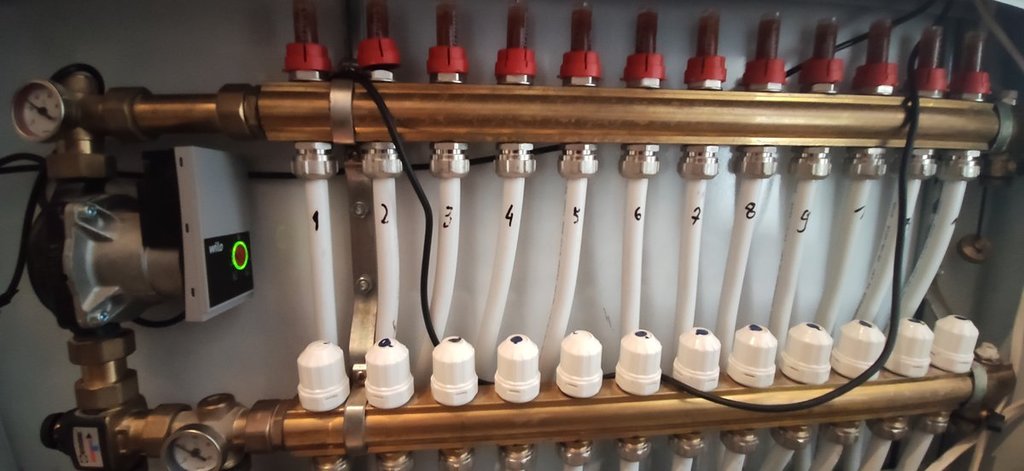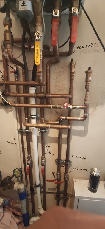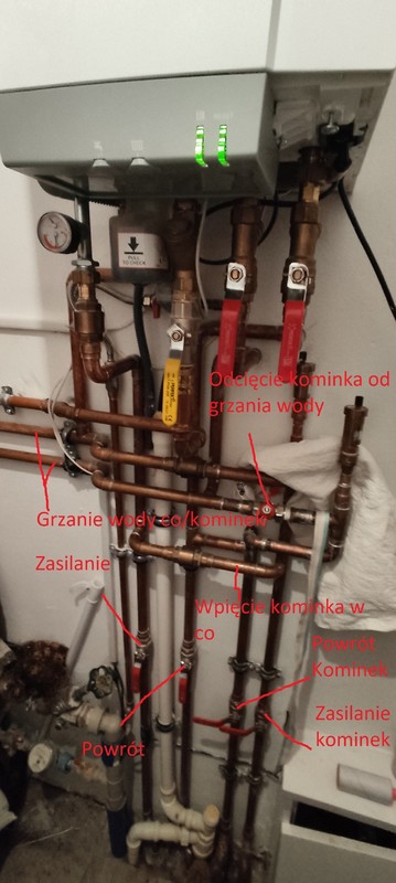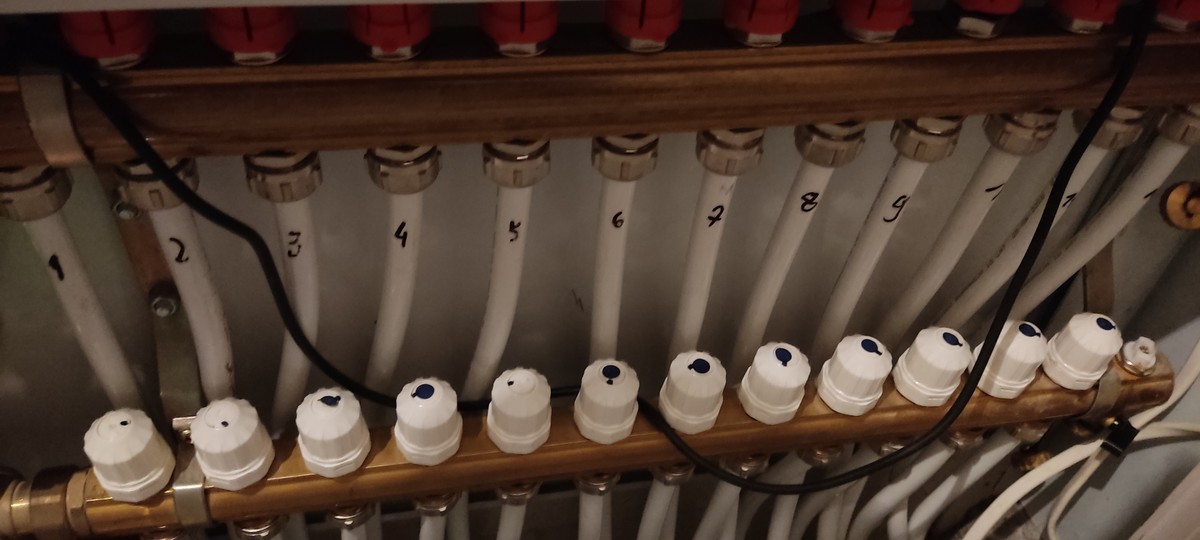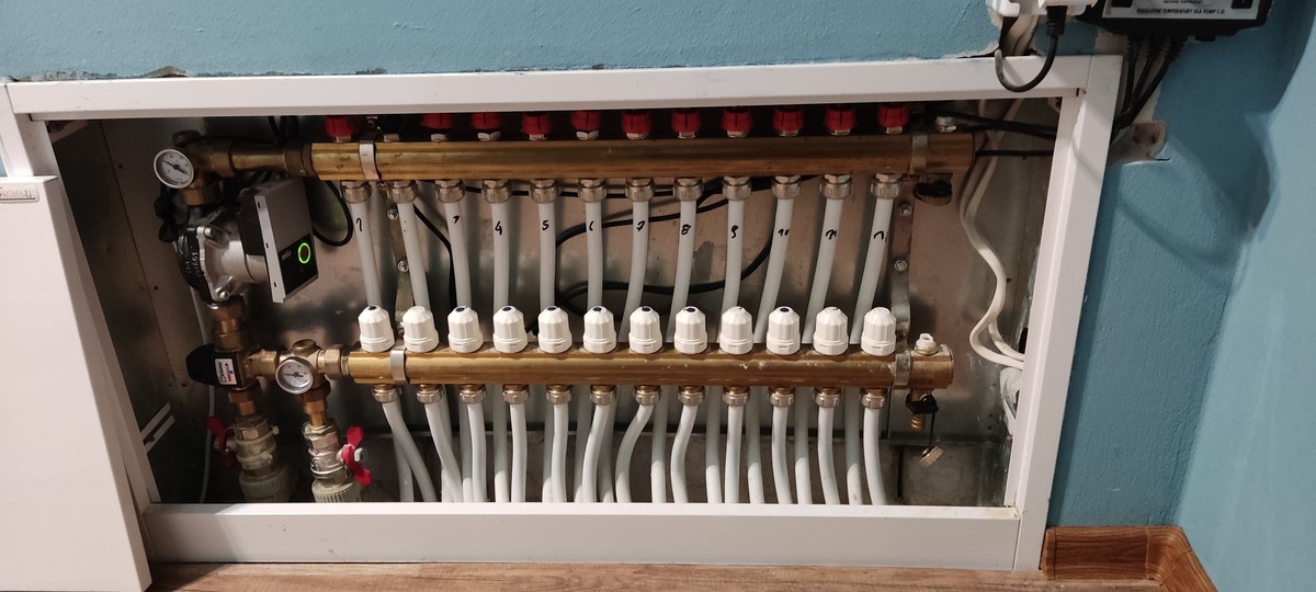Dzień dobry, chciałbym przedstawić swój problem z którym walczę już 2gi rok. Instalacja grzewcza dom 300m 3 rozdzielacze parter 12 lini piętro 12 lini drugie piętro 8 lini każdy rozdzielacz z własną pompa wilo. Zasilane z pieca dwufunkcyjnego z pompą i kominka z pompą. Problem wygląda następująco, gdy chodzi jeden rozdzielacz (jedna pompa)  to rotametry oscylują w granicy 1,5l gdy włączę 2gi rozdzielacz rotametry spadają na obydwu do 1l/m 0,5l min lub niektóre już się zamykają. Natomiast gdy chodzą 3 rozdzielacze rotametry pracują na parterze w granica 1l ,0.5 piętro najbliższe od zasilania w granicach 1l/m ostatnie się nie otwierają i na 2gim piętrze podobnie. Pompki chodzą z maksymalnyą wydajnością ustawione na 6ke. Gdy na jednym rozdzielaczu zostawię jedną pętlę rotametr otwiera się na maksa, po dodaniu 4 pętel spadają na około 2,5 analogicznie otwierając cały rozdzielacz przepływy spadają do 1,5 l/min poniżej załączam zdjęcia instalacji. Proszę o pomoc w rozwiązaniu problemu, zastanawiałem się czy sprzęgło hydrauliczne nie rozwizało by problemu.