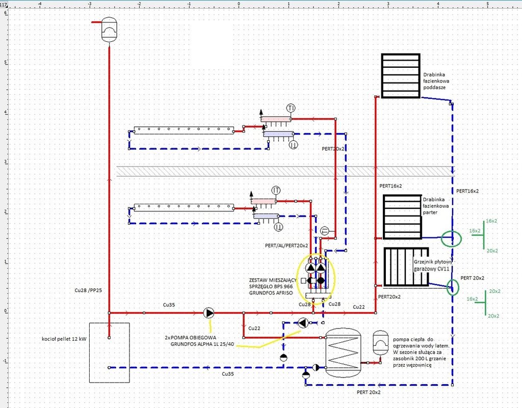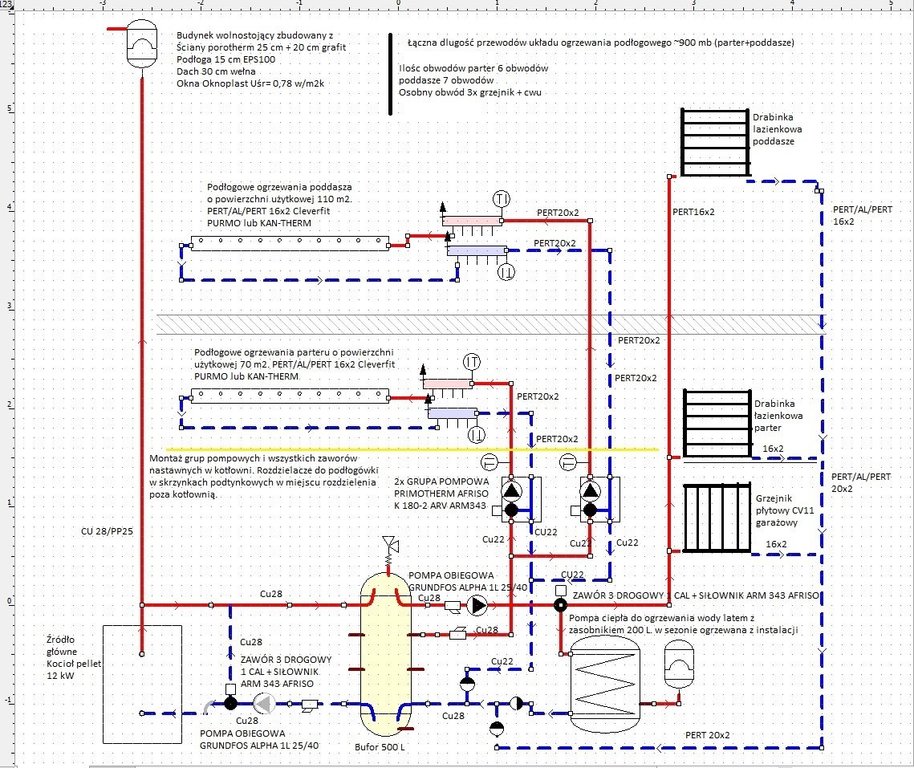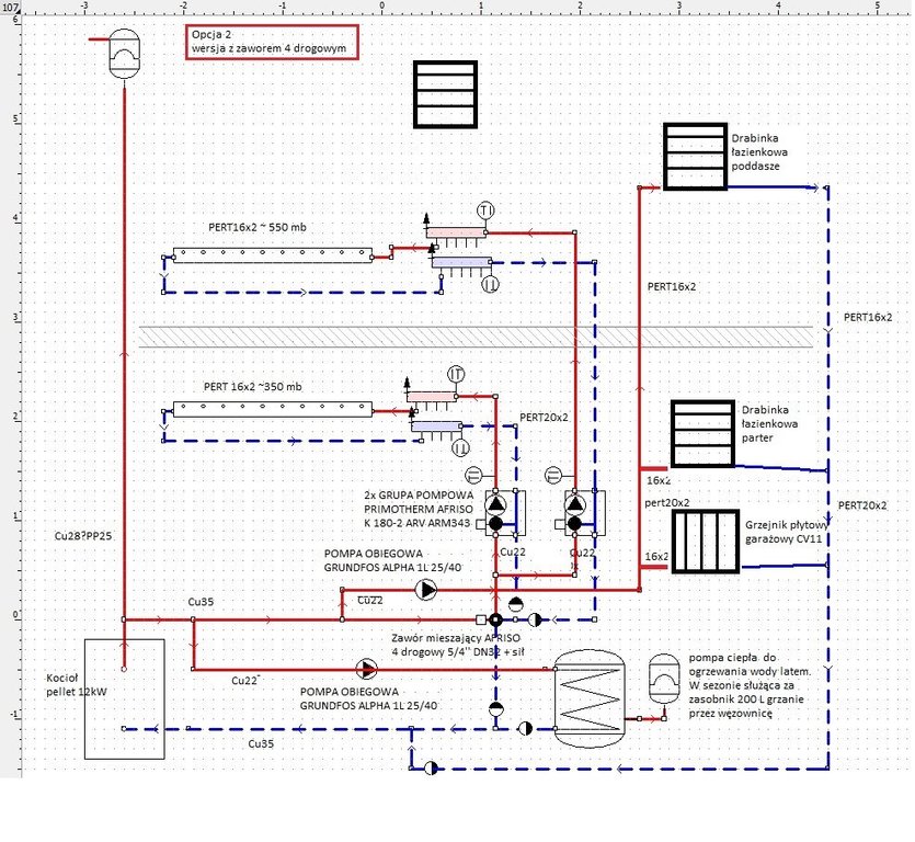 Witam Państwa. Nie chcąc zakładać nowego tematu postanowiłem opisać moje przemyślenia w tym. W najbliższym czasie czeka mnie budowa instalacji c.o. w nowym domu stąd moje pytania o opinię czy w ogóle to co Państwu przedstawiam będzie działać i której z opcji powinienem się najbardziej trzymać. Jako, że jedna wersja zakłada zastosowanie bufora do pieca pelletowego to temat jak najbardziej pasujący. Źródłem zasilania będzie piec na pellet o mocy 12 kW. Myśląc o przyszłości instalacja powinna działać również plug&play gdybyśmy zamiast pelletu wstawili pompę ciepła - powietrzną. To chyba jedyne moje założenie. Proszę o porady co myślicie o takich rozwiązaniach i które wg opinii warto było by zastosować. Oryginalny projekt zakładał to co wskazuje poniżej. Co mi nie pasuje - mieszacze - grupy pompowe w szafkach stwierdziłem, że lepiej mieć to w kotłowni, aby wszystko było razem. Nie myślałem jeszcze na temat sterownia tym wszystkim to jest temat odrębny więc nie będę go tutaj poruszał. nie pasuje mi również zasobnik więc zamiast niego będzie pompa ciepła z zasobnikiem. Źródłem jest kocioł na pellet. W oryginalnym projekcie zastosowano zawór 4 drogowy - armaturę i rurki dobierałem sam więc miło będzie gdybym zobaczył pisemnie opinie w temacie użytych materiałów. W oryginale była też jedna inna rzecz - zamiast podłogówki na poddaszu było 7 grzejników. Zamiennie jest 7 kolektorów. A więc to co widzimy powyżej to układ oryginalny i wierzę, że ktoś to sprawdzał chociaż mam pewne wątpliwości. poniżej przedstawiam przerobienie a może raczej rozbudowę instalacji o inne elementy. Obraz zawiera również inne dane pomocnicze, wypisane z projektu itp. I tak: mamy tutaj bufor 500 L wpięty za kotłem. Pompa na powrocie z zaworem 3 drogowym. Chodzi o przepompowywanie wody pomiędzy buforem a kotłem. Nie wiem czy nie lepiej gdyby pompa była na zasilaniu i czy nie lepsza opcją byłoby wpięcie zasilana z kotła na bufor nieco niżej niż na samej górze. mamy tutaj nieco mniejszą średnice rur ponieważ jest bufor. Z samej góry bufora zasilanie idzie na 3 grzejniki (2 drabinki i 1 płytowy który prawdopodobnie będzie cały czas zakręcony - garaż). w tym przypadku bez pompy raczej się nie obejdzie więc musi zostać. Z tego samego źródła zasilany jest zbiornik pompy ciepła (zbiornik w sezonie będzie ogrzewany z kotła - latem to pompa ciepła) Aby rozdzielić nieco przepływy warto może byłoby zastosować zawór 3 drożny i większość ciepła "pchać" do grzania CWU zamiast na grzejniki. Nieco niżej na buforze wpięta kolejna nitka zasilająca tym razem podłogówkę czy tak może być? a Dlaczego tak? woda w tym miejscu jest nieco chłodniejsza a na podłogówkę nie ma potrzeby aby woda miała 60oC. Tak więc bezpośredni do grup pompowych opisanych na rysunku trafiała by już nieco chłodniejsza woda. Pytanie czy może być to układ jak na schemacie z jednego zasilania na 2 różne drogi - pompy? czy nie będzie tutaj walki pomiędzy pompami? Za pompami całość wychodzi sobie już z kotłowni i idzie na rozdzielacze do podłogówki. Oryginał projektowy to rozdzielacz 6 i 7 obwodów ale damy po 7 obwodów - jedne na parterze zostanie w rezerwie. Jeśli chodzi o podłogówkę robię wg projektu. Ale na instalację mam swój pomysł jak powyżej. Bufor zadziała nieco jak sprzęgło tylko takie w większym rozmiarze. Czy to co jest powyżej to dobrze myślę? łączenie ze średnicami rur i połączeniami czy tak mogłoby być? 2 Opcja przedstawiona poniżej to rozwiązanie zbliżone do oryginalnego projektu: Zastosowałem tutaj zawór 4 drogowy oraz 2 grupy pompowe te same co poprzednio, z tym że są one w kotłowni jak w przypadku instalacji z buforem, a nie jak w przypadku oryginalnego projektu, gdzie grupy mieszające są przy rozdzielaczach. Czy tak może być? czy w takim przypadku jak tutaj rurki mógłby być o takich średnicach czy coś należałoby korygować? Tutaj również inna zmiana względem tego co przedstawiał oryginał mianowicie pompa obiegowa na grzejniki ucieka z głównej nici zasilania na mniejszą średnicę na trójniku podobnie nitka zasilania wężownicy w zbiorniku i również tutaj jest mniejsza pompka żeby to przegonić. Czy takie rozwiązanie jest dopuszczalne? czy nie będzie tutaj walki pomp? na głównej nici zasilania Cu35 są 2 odnogi po 22 mm każda jedna goni na zbiornik druga na grzejniki. Dopiero przy 4 drogowym zaworze mamy zamianę średnicy na 4 drogowym zaworze gdzie zasilanie do góry jest na rurze 22. Czy te pompki w ogóle będą w stanie zassać to wodę i przepchać po podłogówce? tutaj pytanie właśnie konkretnie o tą grupę pompowa czy ona sobie poradzi a że są identyczne to czy nie będą się biły między sobą? Zapomniałem o zaworach zwrotnych są przeważnie umieszczane na powrotach tak aby nie próbowało cofnąć wody ponieważ te powroty wracają do innej rury czy takie zastosowanie ich jest odpowiednie? Ostatni już obiecuję schemat przedstawia wersje z rozdzielaczo-sprzęglem: Schemat jest bardzo podobny do 3 opcji gdzie mieliśmy zawór 4 drogowy. Tutaj również nitki zasilające uciekają na trójnikach ale grzejnikowa nitka jest już poza rozdzielaczem i w dodatku na dużo mniejszej średnicy. Pompa jest na zasilaniu blisko kotła. Zestaw mieszający jest po to aby również niższa temperaturę wysyłać już na instalację tak aby te pompki były w kotłowni a nie gdzieś w szafkach z rozdzielaczami. Czy warto zastosować takie rozwiązanie? mamy tutaj mieszacz z dwoma 3 drogowymi zaworami do mieszania wody na podłogę. Poza sprzęgłomieszaczem znajduje się nitka do grzejników i ona jest wspomagana przez pompę która wychodzi zaraz za kotłem. Do cwu natomiast jest odnoga na trójniku która również pchana jest tą pompką przez weżownicę a następnie wszystkie rurki spotykają się na powrocie i tut