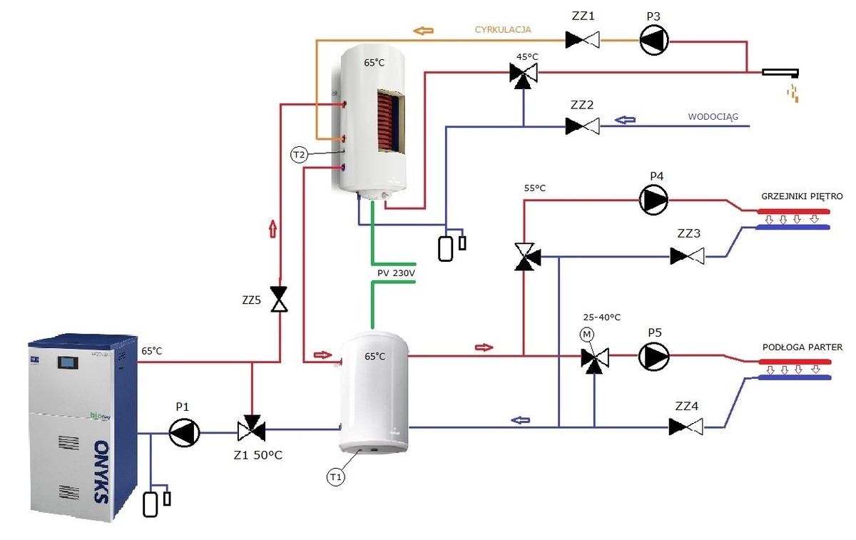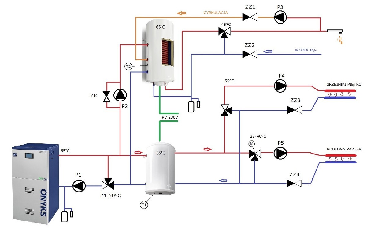 24. Chciałbym popytać dalej, po temacie LINK bo mam już kupiony kocioł Zębiec Onyks 10kW. Zbiornika kombinowanego z buforem nie można już kupić więc mam do dyspozycji bojler 100L z grzałką oraz bufor 60L z grzałką. Bufor mały ale lepszy taki niż żaden w małej kotłowni. Chciałbym dać do Waszej oceny schemat instalacji. Jak widać na schemacie zbiorniki będą wspomagane grzałkami zasilanymi z instalacji PV aby poprawić bilans. Czy schemat wymaga jakiejś zmiany? Czy zawory zwrotne ZZ3 i ZZ4 są w dobrym miejscu i potrzebne? Czy czujnik wody CO (T1) umieszczony w buforze to dobry pomysł? Czy gorąca woda z kotła nie będzie samoistnie uciekać do zbiornika CWU i czujnik w buforze będzie ślepy, i zagotuje się woda? Może założyć zamiast pompy P2 jakiś zawór przełączający obiegi?