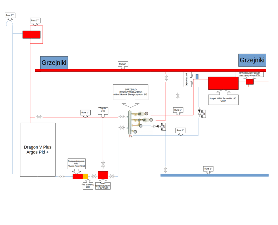 3. Witam, Przymierzam się do wymiany starego kopciucha na piec na ekogroszek. W domu mam starą instalacje otwartą , rury na powrocie i zasilaniu 2 cale . Układ chciałbym zbudować na gotowym sprzęgle z pompami afriso bps 957. Za sprzęgłem zawór trójdrogowy z siłownikiem. Piec Dragon V Plus z palnikiem SV200 19 Kw 170 m do ogrzania. Proszę o ocenę schematu czy poniższy układ ma sens.