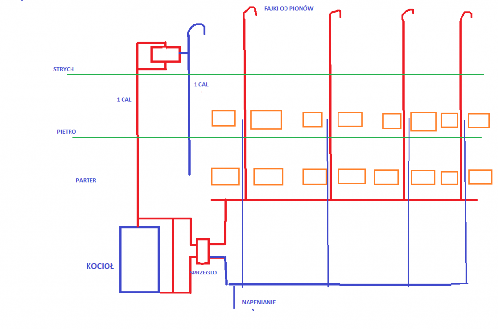 2. Witam serdecznie, Mam problem z napełnianiem instalacji CO. Woda przy napełnianiu układu zamiast przez przelew w zbiorniku naczynia otwartego wylewa się przez fajki odpowietrzające na pionach. Wymieniłem i podłączyłem nowy piec do starej grawitacyjnej instalacji w układzie otwartym. W starym układzie naczynie było zamontowane na jednym z ostatnich pionów, teraz przeniosłem je nad piec. Do kotłowni schodzi rura przelewowa zbiornika 1 cal. Układ wygląda w uproszczeniu jak na rysunku niżej. Fajki pionów są ponad naczyniem o jakieś 30-40 cm. Co zrobić aby woda przy napełnianiu układu leciała przelewem z naczynia zamiast fajkami z pionów? Podnieść je wyżej czy wykręcić fajki i dać odpowietrzniki automatyczne ? W starym układzie ( naczynie wzbiorcze zamontowane na pionie nie nad piecem ) występował ten sam problem . Z góry dziękuje za odpowiedź.