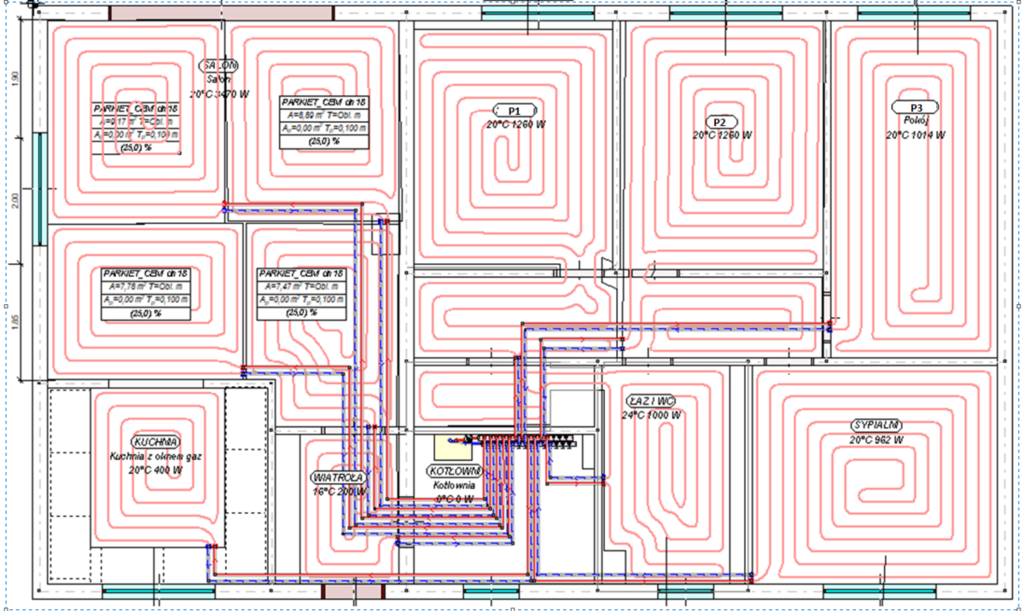 Dzisiaj mam mniej pewności w tym co chcę zrobić więc proszę Was o wsparcie i rady doświadczonych. Za pomocą programu KAN 6.0 zrobiłem projekt ogrzewania podłogowego.