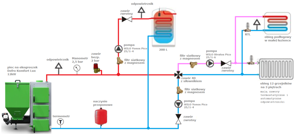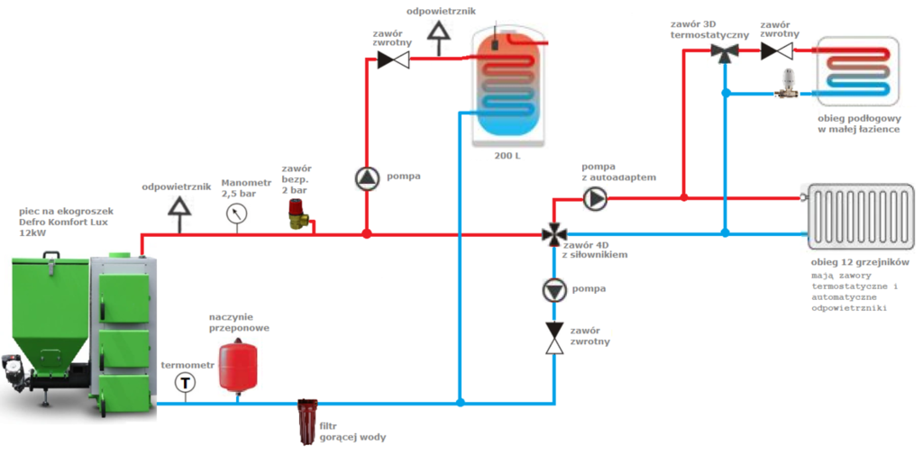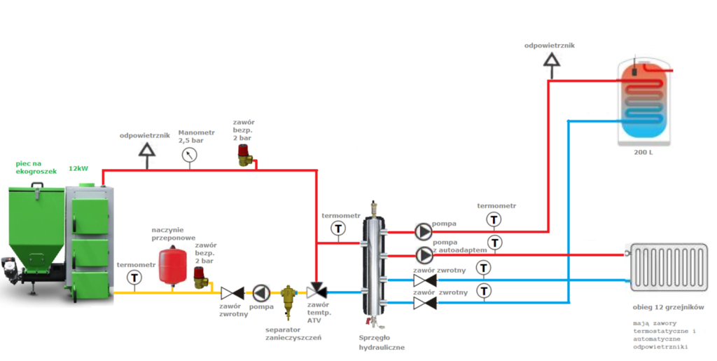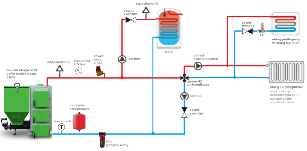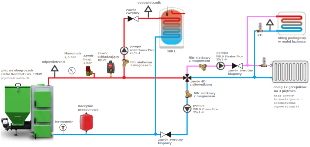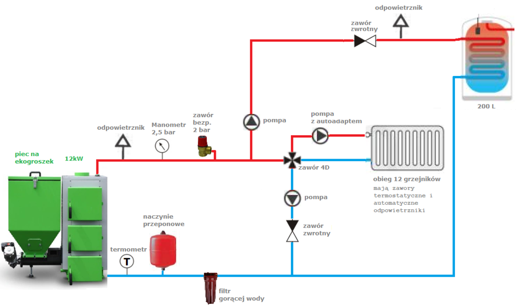 Dziękuję użytkownikom forum za pomocne uwagi, chyba już schemat skończony. Dodałem zawór schładzający, żeby układ zamknięty miał drugie zabezpieczenie. -