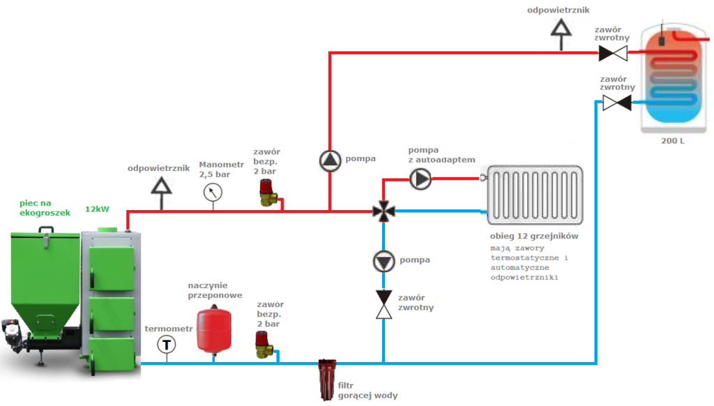 Znalazłem w jakimś poradniku, że: "Instalację warto zabezpieczyć stosując dwa zawory bezpieczeństwa. Na zasilaniu zalecamy montaż grupy bezpieczeństwa (zawór bezpieczeństwa + odpowietrznik + manometr), a na powrocie samego zaworu bezpieczeństwa". Dodatkowym elementem układu zamkniętego, jest wężownica schładzająca, zabezpieczająca przed zagotowaniem. Ja zakładam, że przy małym piecu na ekogroszek nigdy do zagotowania nie dojdzie, bo przy przekroczeniu 85 stopni piec sam wyłącza wiatraki i załącza wszystkie pompy , aby się schłodzić. Piec będzie miał podtrzymanie zasilania UPS.