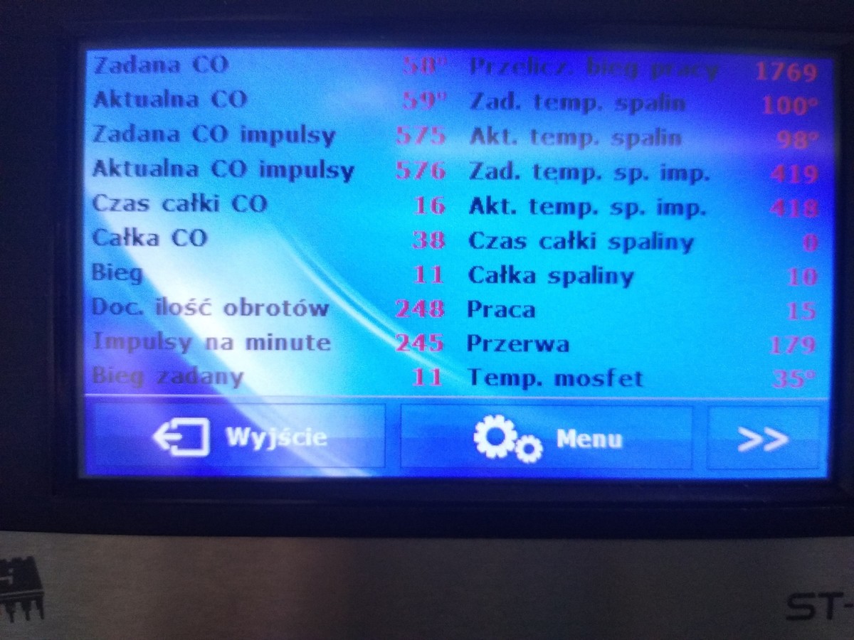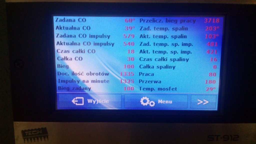 2. Po ponownej instalacji, aby nie mieć problemów z podciśnieniem, należy zmniejszyć procent wentylatora w menu serwis. Ustawiam je tak: Maks. obtoty - 710. Min. obroty - 195. Maks. wentylator robozcy - 55. Min. wentylator - 5. Maks. praca pod. - 7. Min. praca pod. -1. Maks. przerwa pod. - 18. Min. przerwa - 17. Aby nie przegrzać kotła należy obniżyć temperaturę CO do czasu zrównoważenia instalacji. Ustawiłem go na 58 stopni. Kocioł ma zwarcie i 4 W.