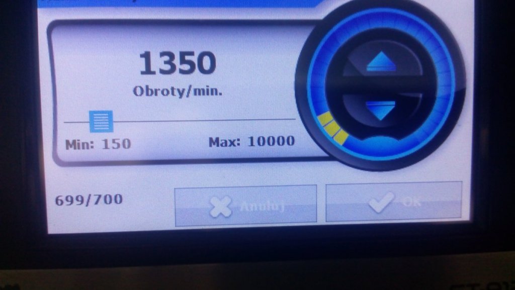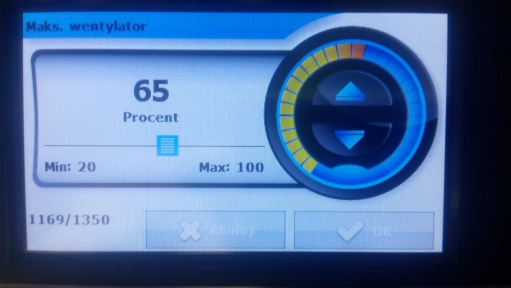 3. Wejście do menu serwis (5162) › Nadmush (5163) › Maks. wentylator. Rozpocznie się test wentylatora. W lewym dolnym rogu zobaczysz, jaką siłę podciśnienia osiągnie w teście. Na przykład może wydrukować ≈ 1350/2100. Następnie w ikonie „Maks. obroty” › pojawi się wartość 2100. Zmniejsz ją do najwyższej testowej wartości. Na przykład 1350. Podczas pracy kotła na „Ekranie produkcyjnym” (2902) zobaczysz wartości. Wartości „Doc. Ilosc. obrotowe ” i „ Impulsy na minutę ”powinny być w przybliżeniu równe. Na zdjęciu ustawiona wartość w "Maks. obróty" to 1335.