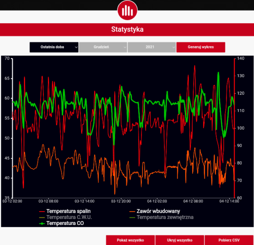 1. Przełączyłem na 22 kW i przy ustawieniach Smoku kocioł pali bez przegrzewania. Kratka jest czyszczona co 4 godziny. Wykres pokazuje, jak temperatura gazów spada poniżej 80 stopni co 4 godziny. Temperatura kotła wynosi 58 stopni.