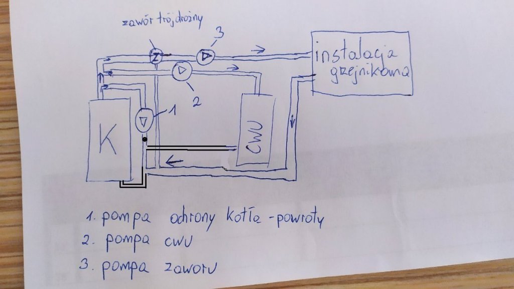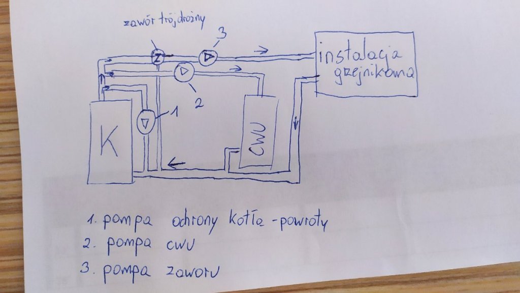 Witam wszystkich użytkowników, zwracam się z prośbą do Was o ocenę poprawności wykonania instalacji CO i CWU. W instalacji podłączony jest kocioł pelletowy. Planuję dołożenie przed sezonem zimowym termostatu pokojowego i wgłębiając się w temat doczytałem, iż termostat może sterować pompą CO lub zaworem (pompą zaworu lub obniżenie temp.). Niestety jak zacząłem sprawdzać to w moim przypadku nie posiadam pompy CO (mimo, że w sterowniku pieca jest taka) i teraz się zastanawiam czy na pewno wszystko mam dobrze zrobione. Tak jak w schemacie zaznaczyłem mam zamontowane 3 pompy: powrotu, CWU i zaworu oraz zawór trójdrożny. Czy aby na pewno pompa za zaworem to ta pompa zaworu? Czemu nie mam pompy CO? Czym one się w ogóle różnią (pompa CO od zaworu)? Bardzo dziękuję za wszelkie sugestie i podpowiedzi