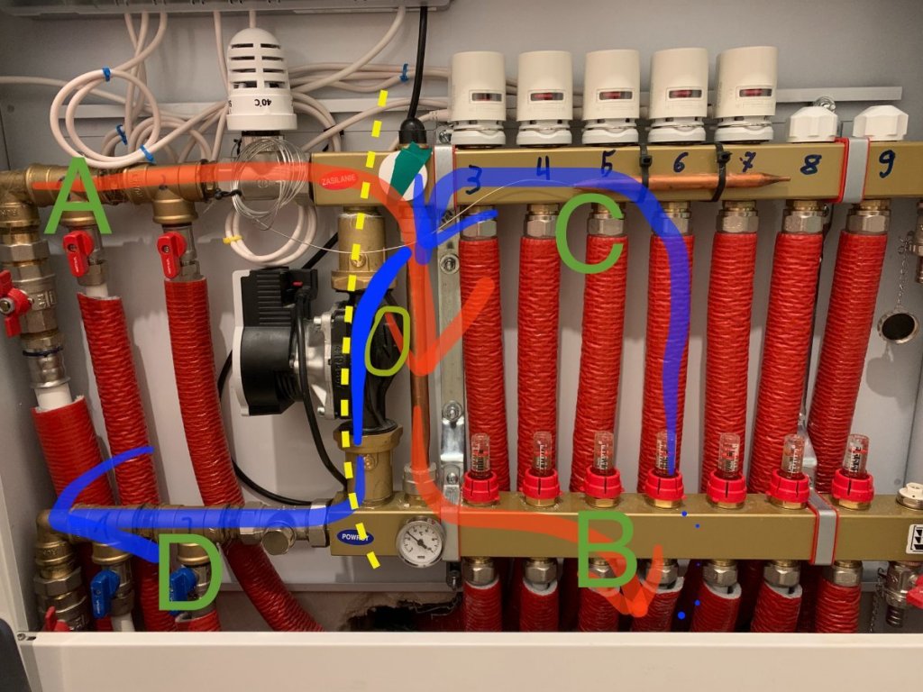 Na schemacie poniżej widać, że gorąca woda od pieca jest schłodzona zanim trafi na pętle. przy ograniczeniu na zaworze do 25 stopni w pętle szła chyba zimna woda i dlatego nie mogłem dogrzać.