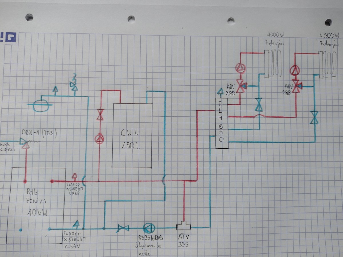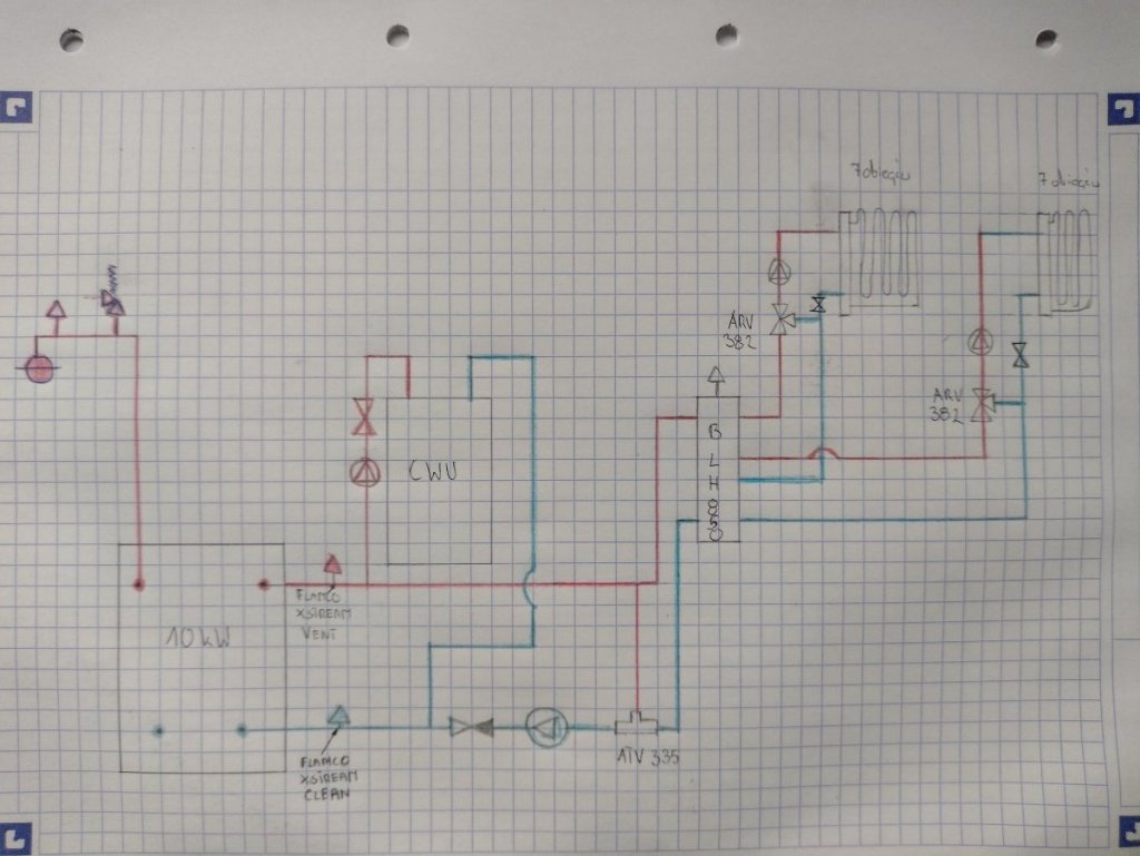 Witam. Proszę o zweryfikowanie koncepcji instalacji CO+CWU. Kocioł na pellet 10 kW, dwa obiegi ogrzewania podłogowego parter i poddasze, oba po 7 pętli. Chciałbym, aby każdy obieg sterowany był niezależnie pogodowo. Długość pętli nie przekracza 90m. Zapotrzebowanie parteru to 4000W, poddasza 4300. Mam wątpliwości ,czy powrót CWU jest w odpowiednim miejscu. Czy nie lepiej będzie gdyby był wpięty pomiędzy zaworem ATV a pompą? Czy zawory zwrotne są odpowiednio umieszczone? Zawory trójdrożne będą wyposażone w siłowniki. Zorientowałem się, że brakuje jeszcze filtrów skośnych przed pompami obiegowymi i separatorem.