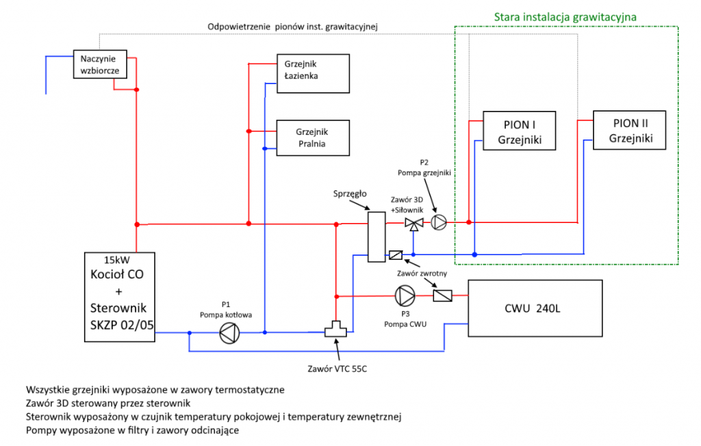 Witam forumowiczów, po kilku miesiącach lektury forum nadszedł czas na narysowanie projektu schematu. Przede mną wymiana kotła na kocioł na ekogroszek i przebudowa rur i podłączenia kotła. Obiekt to typowa piętrówka z lat 70-tych, piwnica(nieogrzewana), parter i piętro, ocieplona. Obecnie instalacja grawitacyjna na kaloryferach aluminiowych. Doszedłem do wniosku że starych stalowych rur nie będę jak na razie wymieniał, nic nie cieknie, są ocieplone i schowane w ścianach. Czeka mnie jedynie przebudowa rurociągów w samej kotłowni. Proszę o ocenę schematu. mam kilka pytań do poprawności działania schematu: czy grzejniki w pralni i łazience będą działać w takim układzie (niezależne od temp w domu), czy potrzebny jest zawór 3D mieszający(sterowany przez SKZP czujnikiem pokojowym) temp wody na grzejniki, czy gdy zawory termostatyczne się zamkną/przymkną to pompa wypchnie mi wodę przez odpowietrzenie pionów do naczynia, zawór VTC/ATM na 5/4" czy 1" starczy Z uwagi na zamontowane grzejniki aluminiowe(około 20-letnie) nie chcę używać miedzi w instalacji. Zastosuję rury stalowe czarne 5/4" obieg kotłowy+naczynie, 1" do sprzęgła, PP32 sprzęgło - stara instalacja, PP32 obieg CWU- 8 odpowiedzi