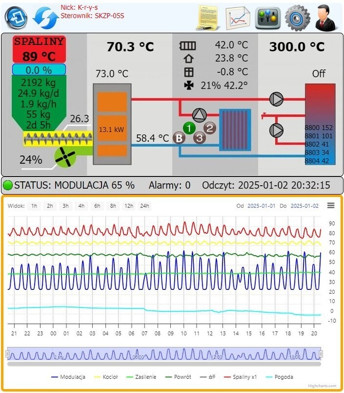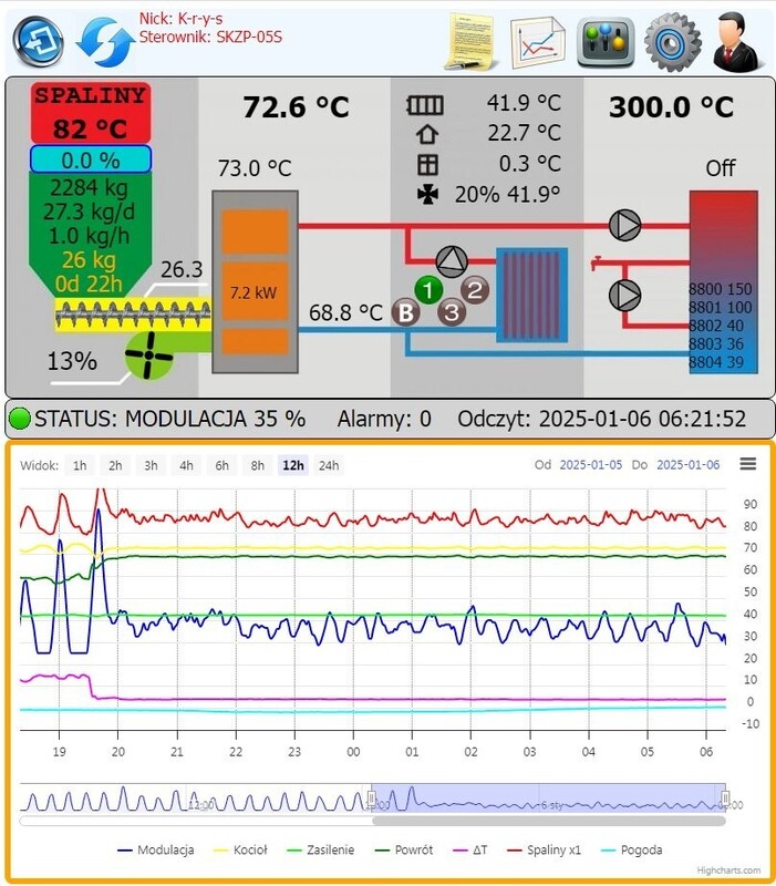 Mam do Was pytanie. Miałem Argosa Black i to co się działo z modulacją itd. to istna porażka (tak wiem, że już jest dużo lepszy), ale gdy się "przesiadłem" na SKZP-05 to modulacja bardzo się poprawiła. Ale czy taki wykres modulacji jest poprawnym wykresem, czy jednak jeszcze za bardzo faluje? Temperatura kotła +- 2 stopnie od zadanej. Zadane kocioł 73, zasilanie grzejniki 40 + korekta pog. 2 stopnie