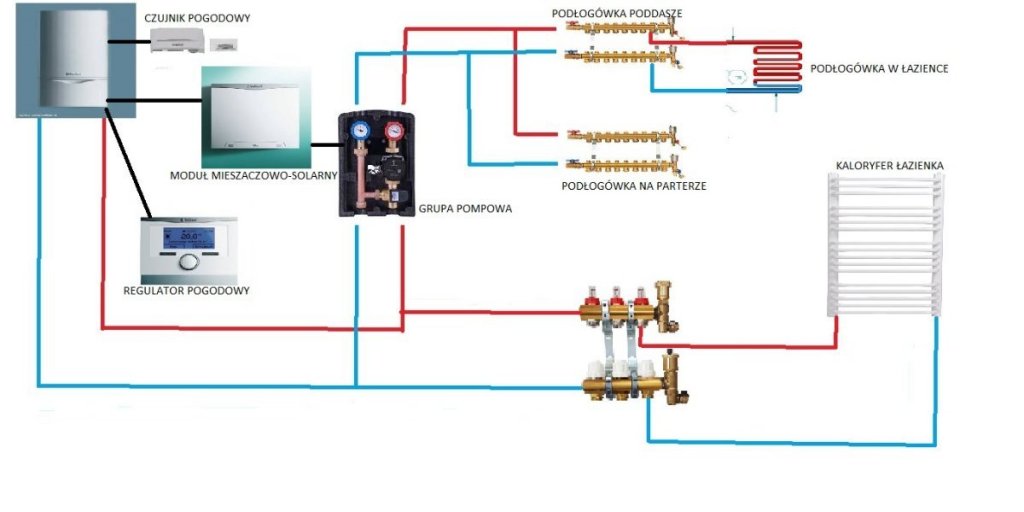 W domu jednorodzinnym instalator wykonał mi instalacje grzewczą wg poniższego schematu.Instalacja funkcjonuje już 2 lata. Ogólnie działa ok ale mam jednak niedogrzaną  łazienke.W salonie znajduje się regulator pogodowy który ustawiam najczęściej na temp 22-23 st. Ogrzewanie na parterze jest ok na poddaszu również.... oprócz łazienki .Na rozdzielaczu podłogówki na poddaszu wszystkie przepływomierze są przykręcone na min . oprócz pętli która idzie na łazienkę i pralnię .Takie ustawienie również nie przynosi pożądanego cieplnego  efektu.W łazience i pralni, które są ze sobą połączone ,mam zamontowane  2 kaloryfery i są zasilane tak jak na rysunku.Niestety temperatura zasilania tych kaloryferów jest taka sama jak zasilanie podłogówki tzn zbyt niska aby dogrzać pomieszczenie.Czy istnieje możliwość jakiejś przeróbki aby podnieśc temp na grzejniki np do temp 40st aby pracowały one niezależnie od podłogówki?