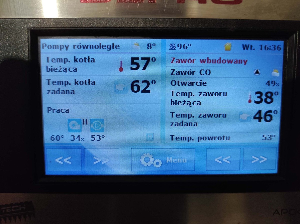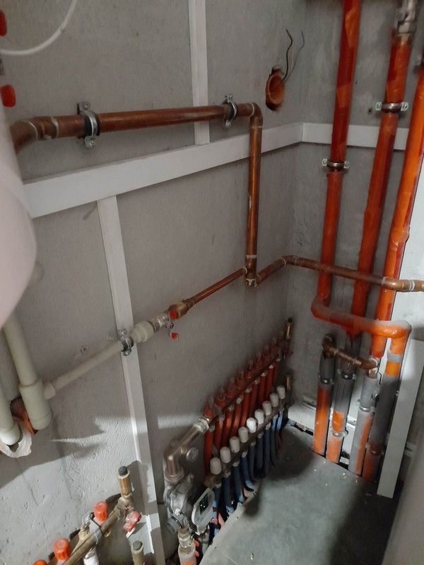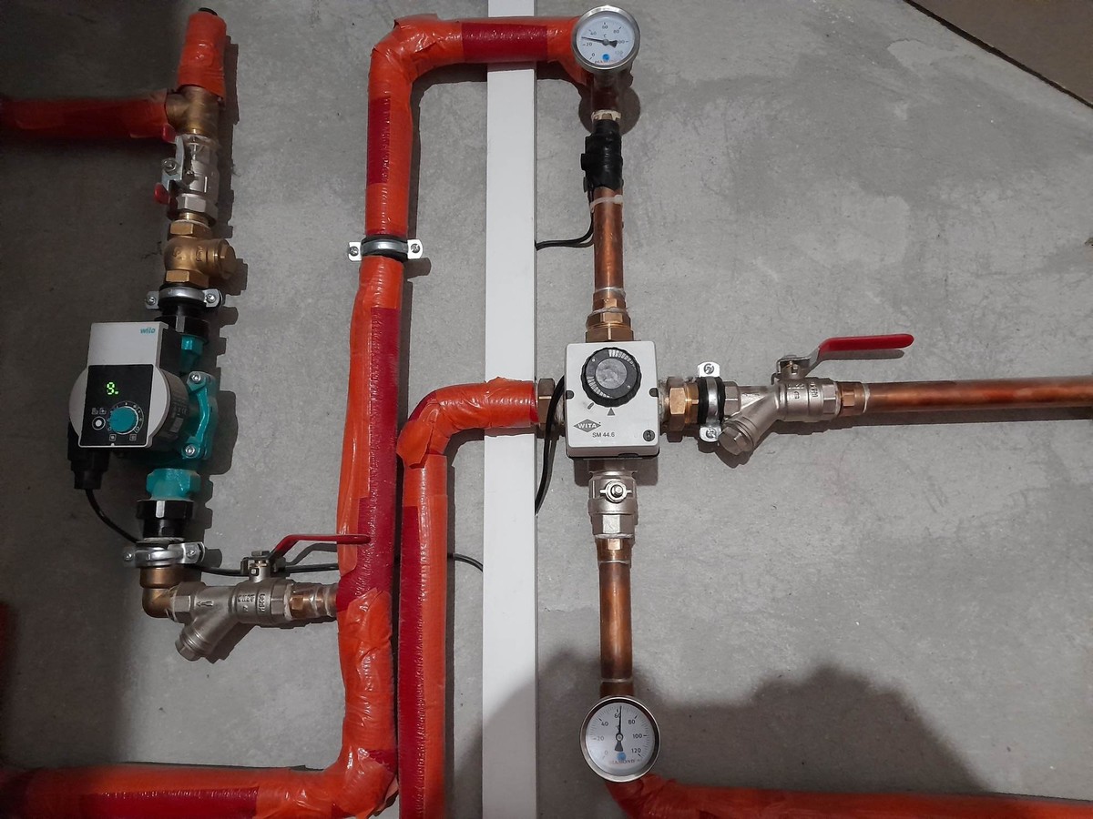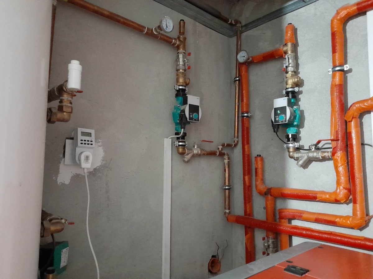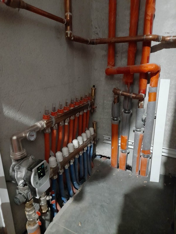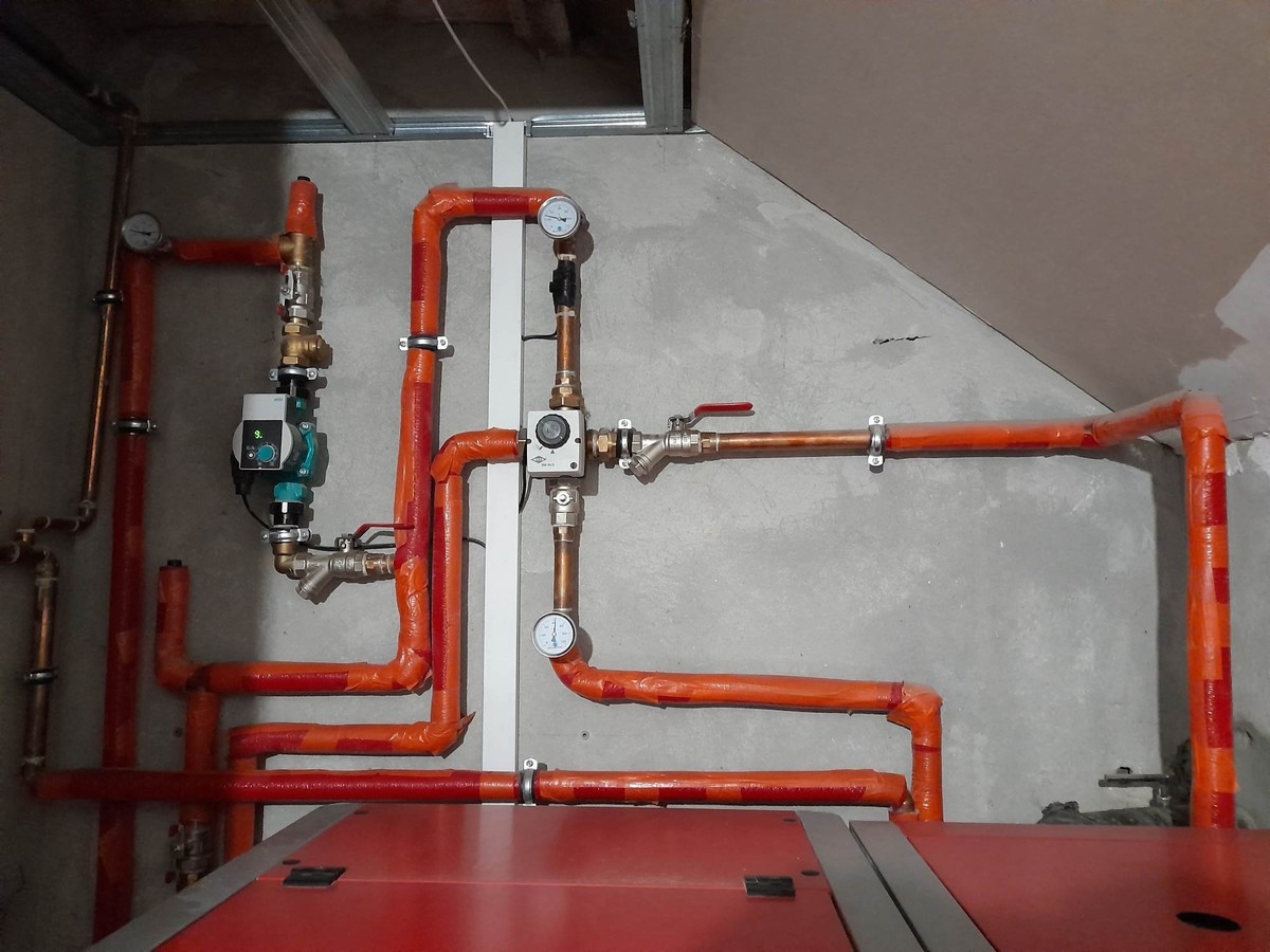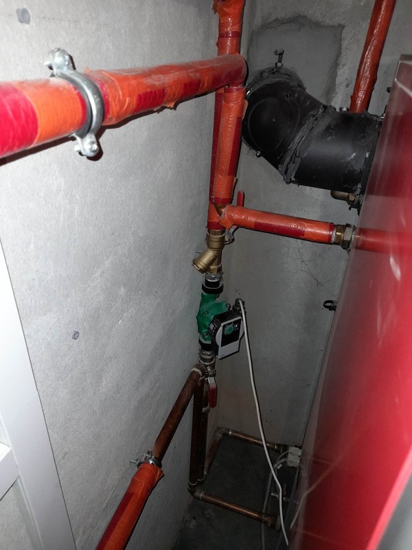 Jestem nowy na forum, z minimalna wiedza w sprawie instalacji grzewczych i zwracam sie do was koledzy z prosba o sprawdzenie instalacji, ktorej zdjecia zamieszczam ponizej. Problemem jest zimny powrot wychladzajacy kociol przez co piec pracuje bardzo niestabilnie. Problemu nie wykluczyla zamontowana pompa na powrocie. Ostatnio udalo mi sie wyrownac odrobine prace kotla poprzez wylaczenie funkcji PID. Wczesniej przy pracy na algorytmie piec nie mogl dojsc do zadanej przez wiele godzin, temperatura spalin byla wysoka (ok. 130 stopni) oraz piec palil okolo 2 workow pelletu Lava na dobe. Dodam, ze to stary dom z cegly po renowacji. Ocieplony od wewnatrz welna celulozowa o gr. 16cm. na stropie 40cm celulozy. Na parterze podlogowka 100m2, pietro grzejniki 50m2. Sterowanie pompą CO przez regulator pokojowy Salus. Mam nadzieje, ze jakos zdjec jest wystarczajaca.