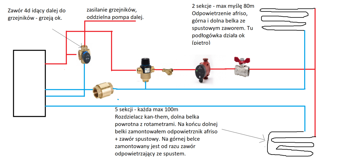 Własnie tak to jest zrobione jak przedstawiłeś. Za tą pompą od grzejników jest jeszcze ZZ. Pompa od grzejników nie była uwzględniona na schemacie, ale wspomniałem o niej w ktorymś poście. Generalnie grzejniki chodzą ok, chodzi teraz o sam powrót z podłogówki i grzejników. czyli tak jak teraz będzie ok? -