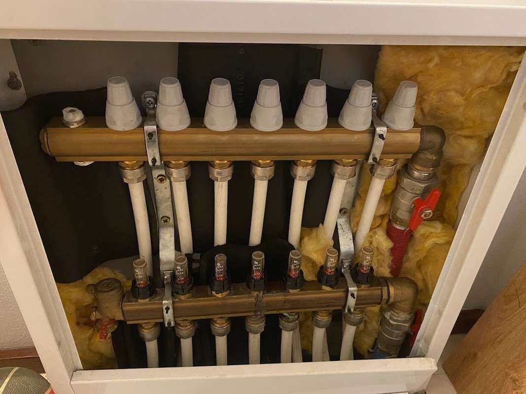 1. Cześć, chciałbym się podłączyć pod temat - mam jakieś wyzwanie z podłogówką w domu, który kupiłem na rynku wtórnym. Generalnie instalacja wygląda następująco: 1. Piec klimosz ling combi 23kw - pellet 2. Grzeje CO/CWU 3. Parter podłogówka/ piętro grzejniki i podłogówka w łazience 4. Pełna pogodówka (chyba) - mam czujnik temp w domu (piętro) i na zewnatrz 5. Piec nastawiony na 22stopnie, krzywa 5 ad meritum - podłogówka jest jakaś nie wydajna, wcześniej myślałem że to kwestia tego że system bardziej dogrzewał piętro i potem się zamykał automatycznie, ale teraz przy niższych temperaturach jest praktycznie stale bardziej lub mniej otwarty. Pompa do podłogówki działa na 3cim biegu wiec pomuje ile da radę. Zawór ESBE ustawiony na max (w jego przypadku to 6) W skrzynce od podłogówki ciepło... rurki cieple ale na powrocie zimne i teraz jakbym nie kręcił rotametrami nie ma żadnej reakcji, tzn wskaźnik ilości przepływu wody pozostają w zależności od zaworu w pozycji od bliskiej 0 do max 1 dodaję zdjęcia pogądowe. będę bardzo zobowiązany za wszelkie rady...